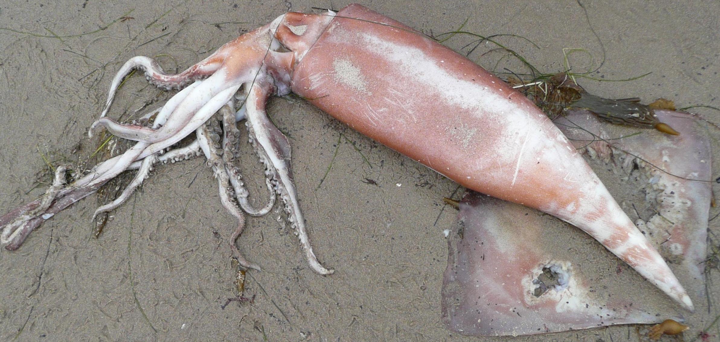 보통 깊은 물을 선호하지만, 2004년 말에는 1,000~1,500마리의 오징어가 워싱턴주 남서부의 롱비치 반도에 밀려왔고,[27] 2012년 말에는 몬터레이만에서 2개월에 걸쳐 평균 길이 약 0.46m의 어린 오징어들이 해변으로 밀려왔는데, 유해 조류가 원인으로 추정되었다.[28]