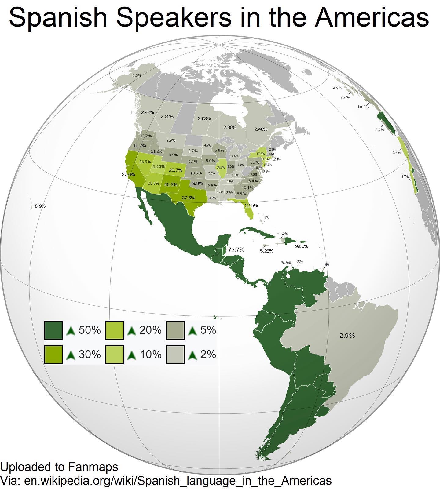 미국 영향력이 더 강하고 직접적이므로 히스패닉 아메리카에서 영국식 표현이 스페인보다 훨씬 더 흔하다. 칠레와 아르헨티나의 영국식 표현은 그곳에 정착한 영국인들의 영향으로 매우 흔하다.[3]마찬가지로, 아메리카 원주민 언어는 히스패닉 아메리카 스페인어에 흔적을 남겼으며, 이는 식물, 동물, 문화적 습관과 관련된 어휘에서 특히 두드러진다. 유럽 스페인어 또한 아메리카 원주민 기원의 수많은 단어를 흡수했으며, 역사적 이유로 이 단어의 대다수는 나우아틀어와 다양한 카리브해 언어에서 가져왔다.[3]
