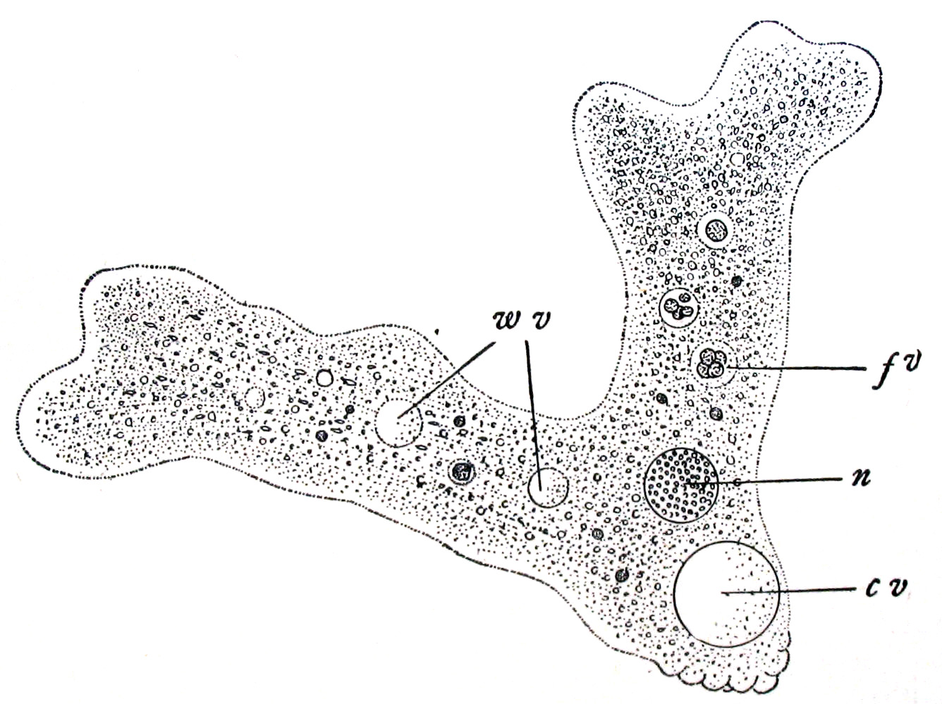 n: 핵, w.v.: 수포, c.v.: 수축포, f.v.: 식포