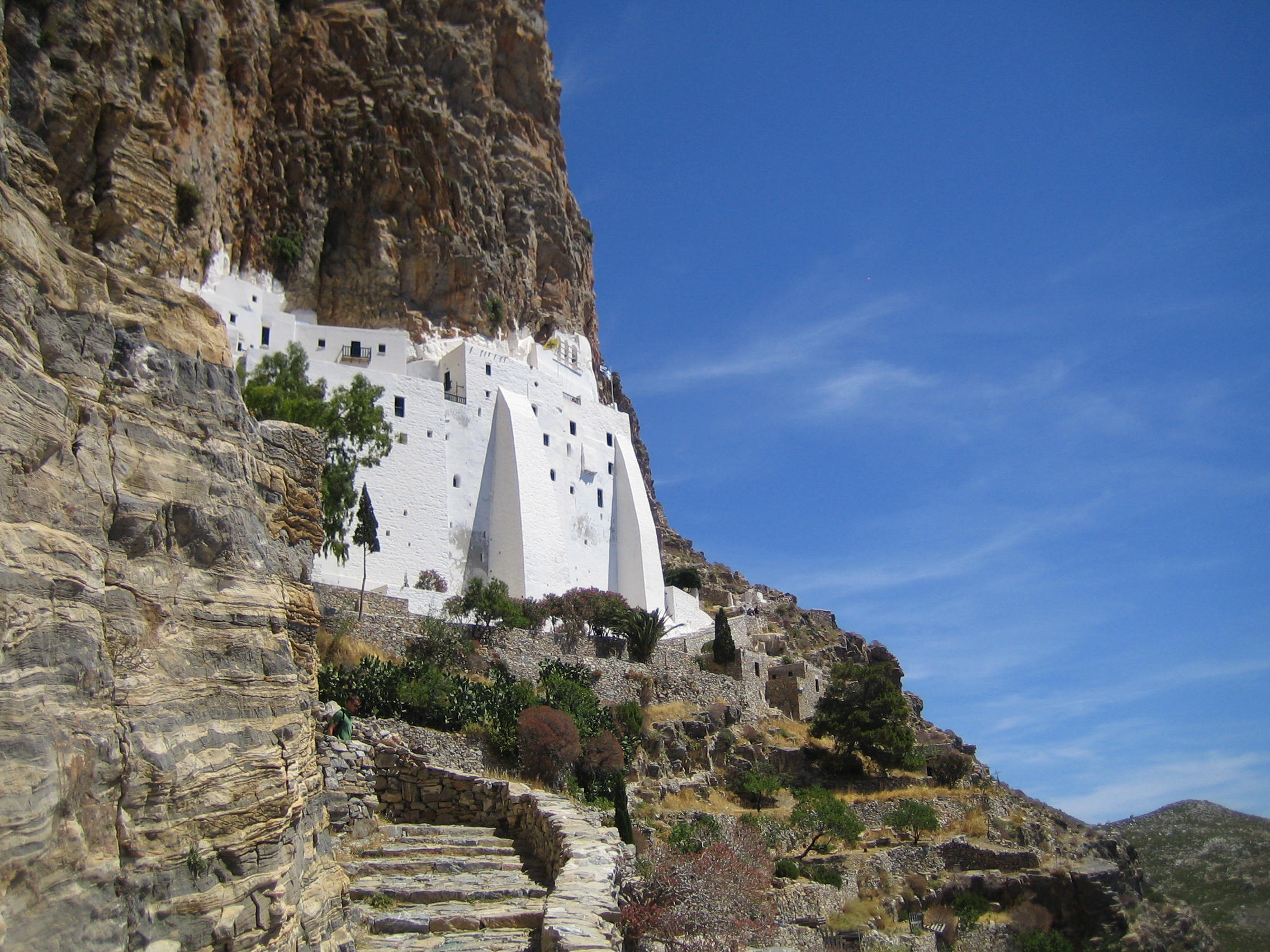 호라 북동쪽에 있는 파나기아 코조비오티사 수도원은 절벽에 기대어 지어졌다.