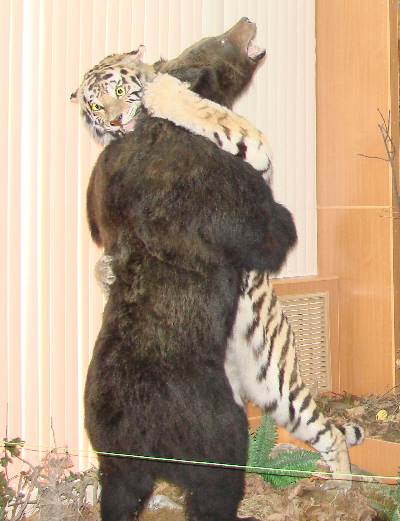 블라디보스토크 박물관에 전시된 갈색곰과 시베리아 호랑이의 박제 전시물