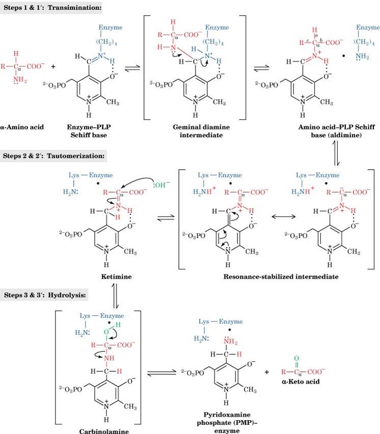 아미노기 전이효소에 의해 촉매되는 아미노기 전이 반응은 두 단계로 일어난다. 첫 번째 단계에서 아미노산의 α-아미노기가 효소로 전달되어 해당 α-케토산과 아미노화된 효소를 생성한다. 두 번째 단계에서 아미노기는 케토산 수용체로 전달되어 아미노산 생성물을 형성하는 동시에 효소를 재생한다. 아미노산의 입체 특이성은 아미노기 전이 반응 동안 결정된다. 반응을 완료하려면 아미노기 전이효소는 알데히드 함유 조효소인 '''피리독살-5'-인산 (PLP)'''(비타민 B6의 유도체)의 참여가 필요하다. 아미노기는 이 조효소를 '''피리독사민-5'-인산(PMP)'''으로 변환하여 수용된다. '''PLP'''는 효소의 '''Lys''' 잔기의 ε-아미노 그룹과 알데히드 그룹의 축합에 의해 형성된 Schiff Base 연결을 통해 효소에 공유 결합된다. 효소의 피리디늄 고리에 결합된 Schiff base는 조효소 활성의 초점이다.[1]