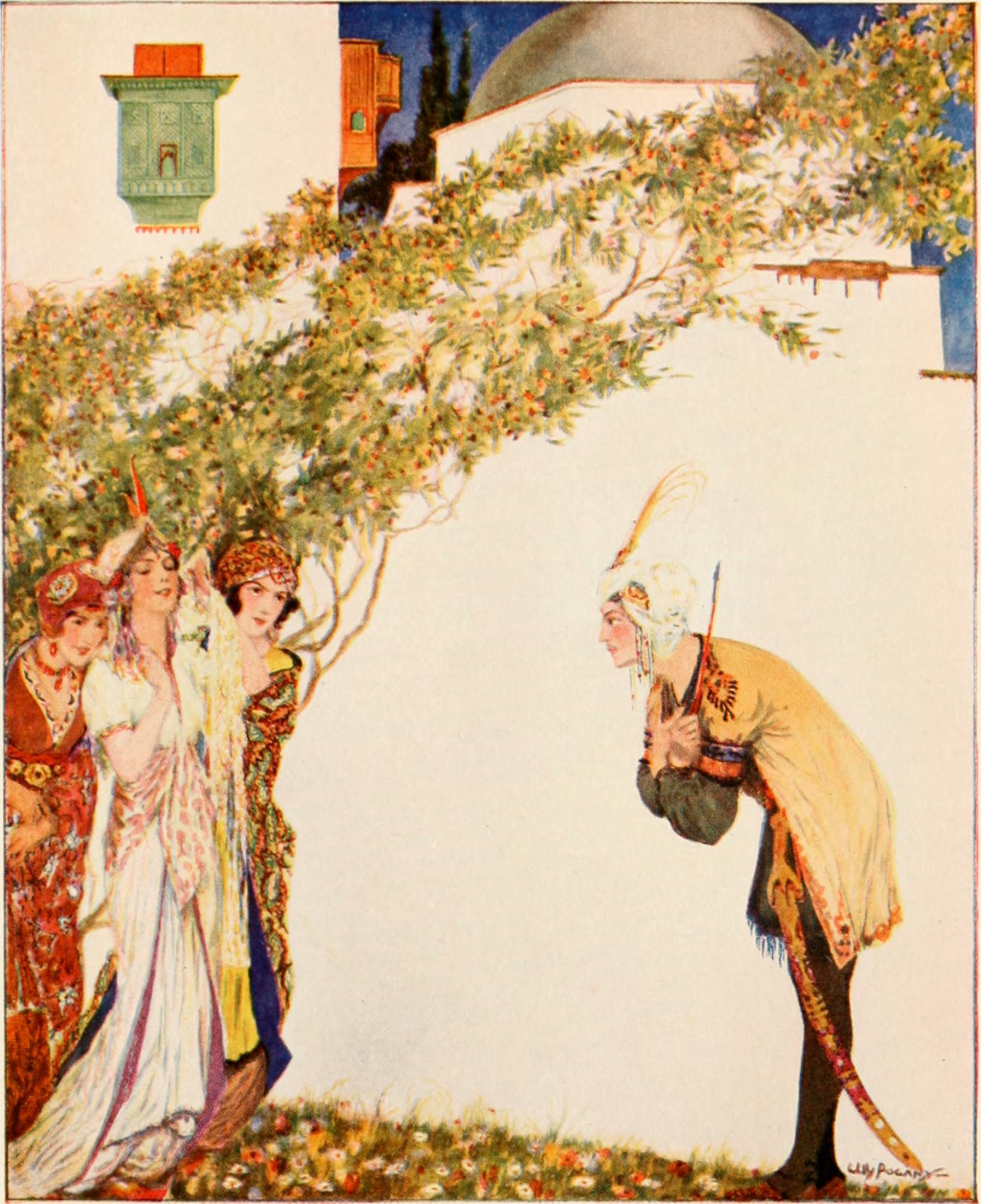 하룬 알 라시드(재위 786–809)가 바그다드 궁정에서 샤를마뉴가 보낸 사절단을 맞이하는 모습. 1864년 독일 화가 율리우스 쾨케르트(1827–1918)의 그림(캔버스에 유채).