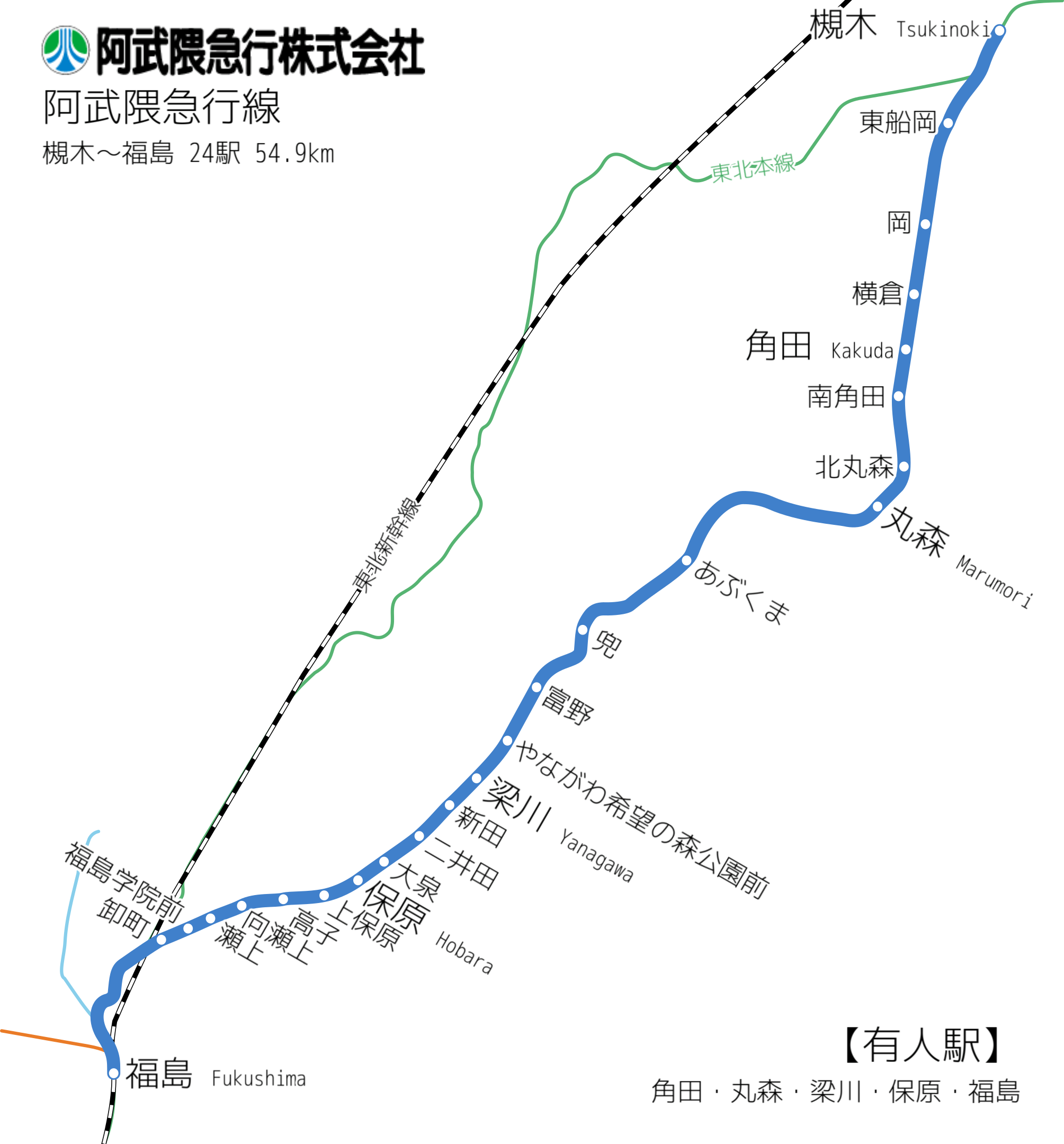아부쿠마 급행선 : 후쿠시마 - 쓰키노키 (54.9km, 24개 역[5], 제1종 철도 사업자. 후쿠시마 - 야노메 신호장 구간은 JR 동일본 도호쿠 본선과 시설을 공용)