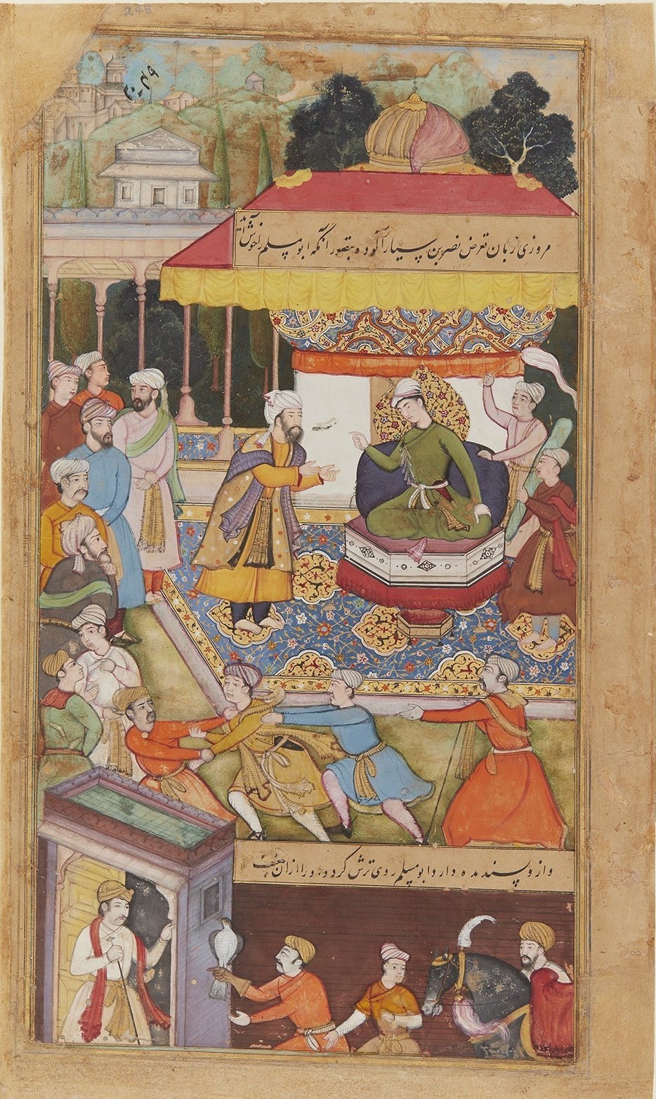 "아부 무슬림이 이야기를 하는 남자를 꾸짖는 모습," 나시르 알딘 투시(Nasir al-Din Tusi)의 『나시리의 윤리』(『아흘라크-이 나시리』)의 삽화. 라호르에서 1590년에서 1595년 사이에 제작됨
