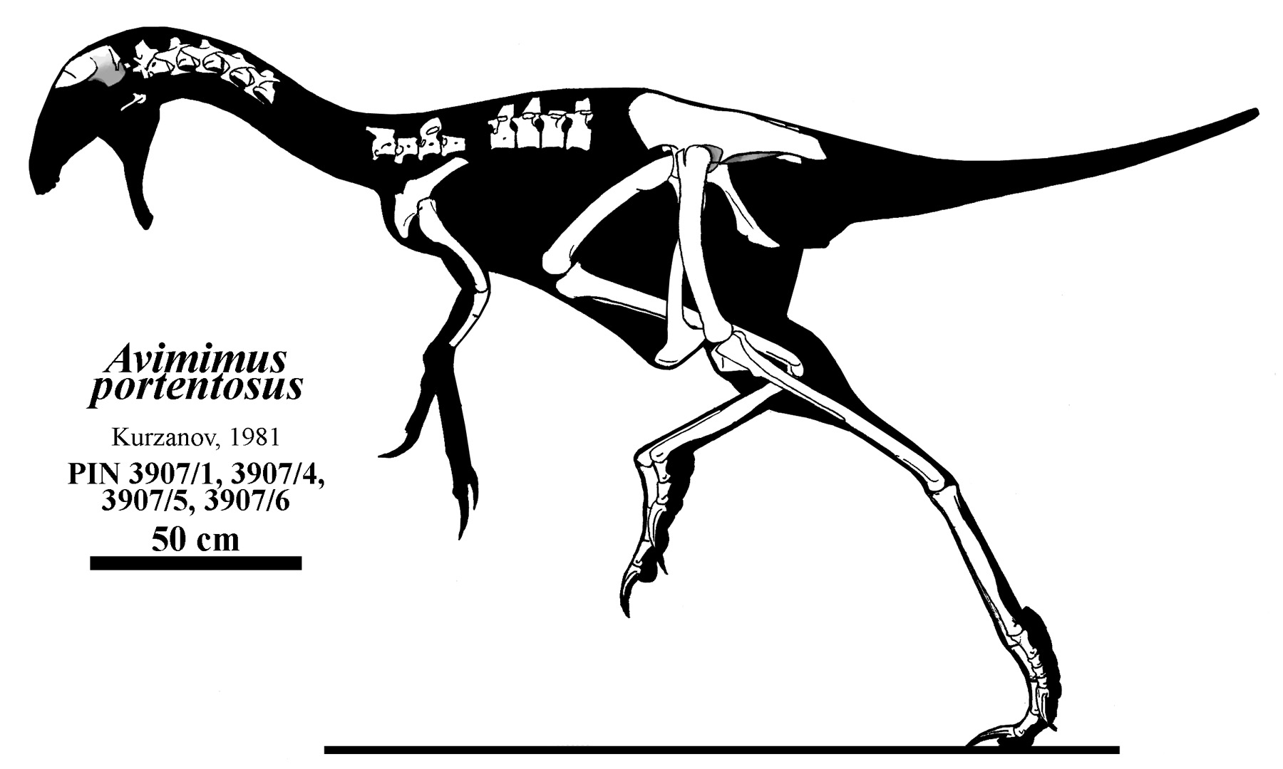 ''아비미무스''의 유해는 러시아 고생물학자들에 의해 수집되었고[1] 1981년 세르게이 쿠르자노프 박사에 의해 공식적으로 기술되었다.[1] 모식종은 ''A. portentosus''이다.[8] 최초 발견 시 꼬리가 발견되지 않아 쿠르자노프는 살아있는 ''아비미무스''에게 꼬리가 없다고 잘못 결론 내렸다.[1] 그러나 꼬리 척추뼈를 포함하는 이후의 ''아비미무스'' 발견은 꼬리의 존재를 확인했다.[1] 1996년에 두 번째 거의 완전한 ''아비미무스'' 표본이 발견되었고 2000년에 와타베와 동료들에 의해 기술되었다. 또한, 이 저자들은 같은 지역에서 발견된 수많은 작은 수각류 발자국이 ''아비미무스''에 속한다고 확인했다.[3]