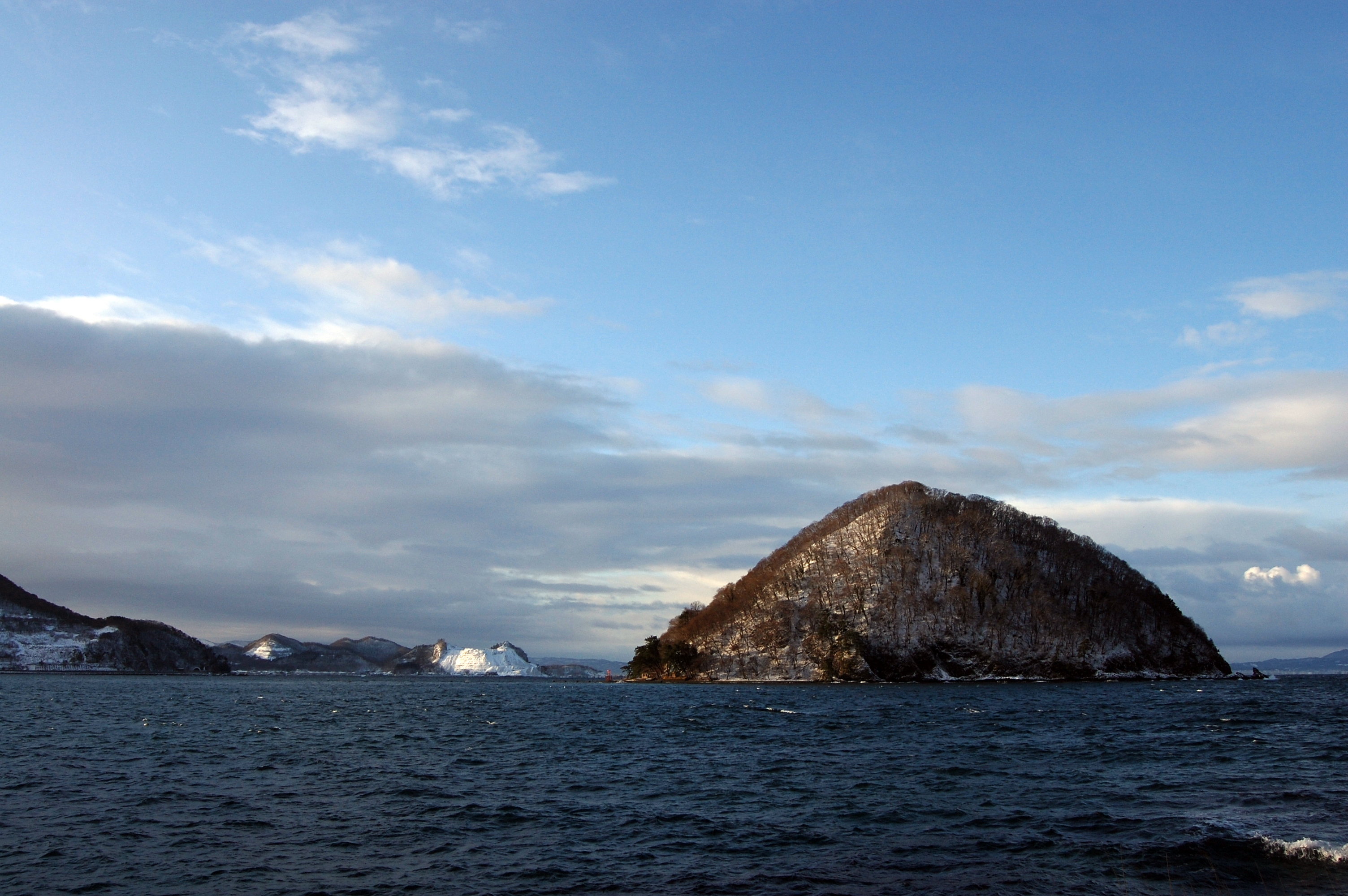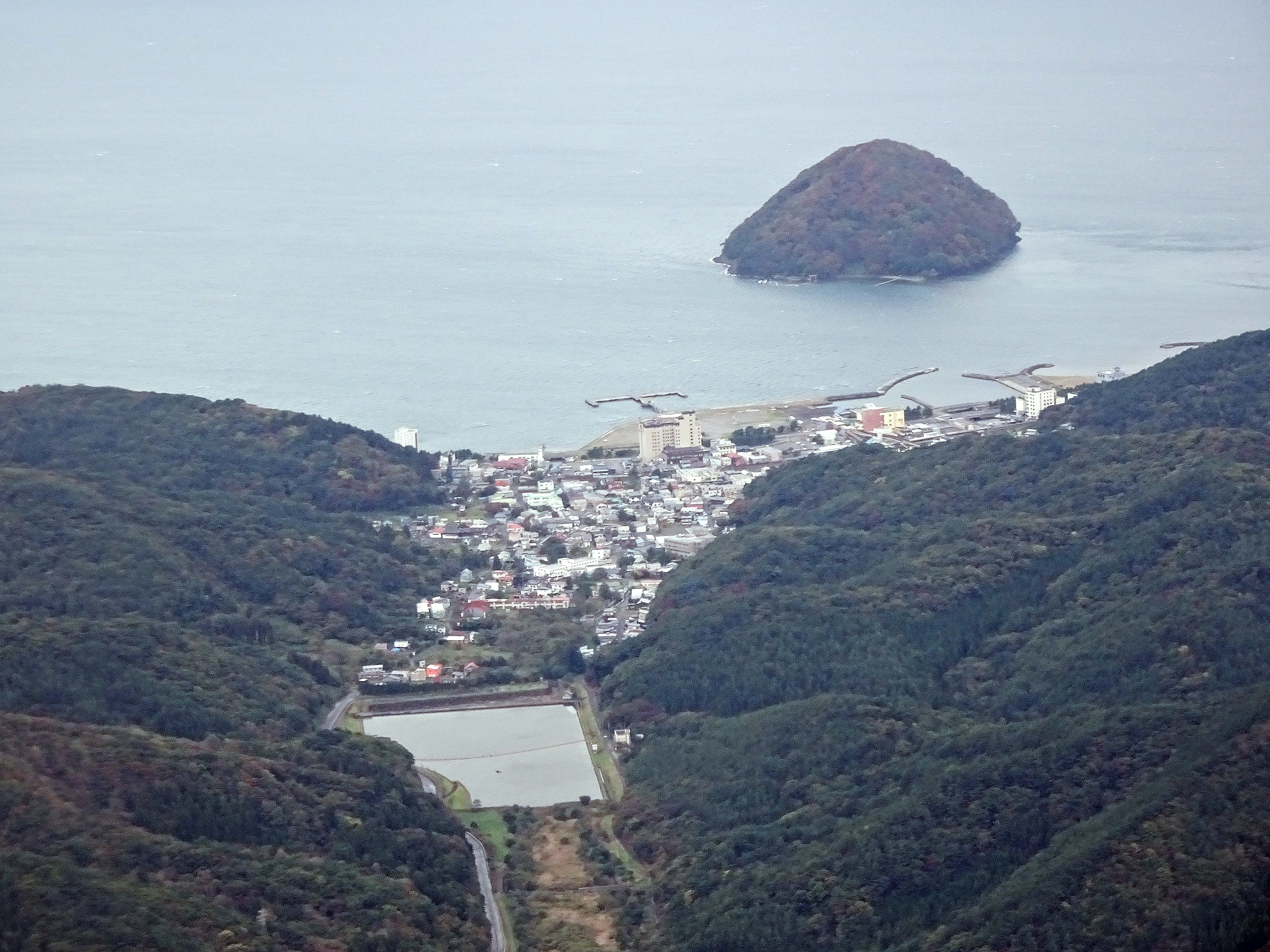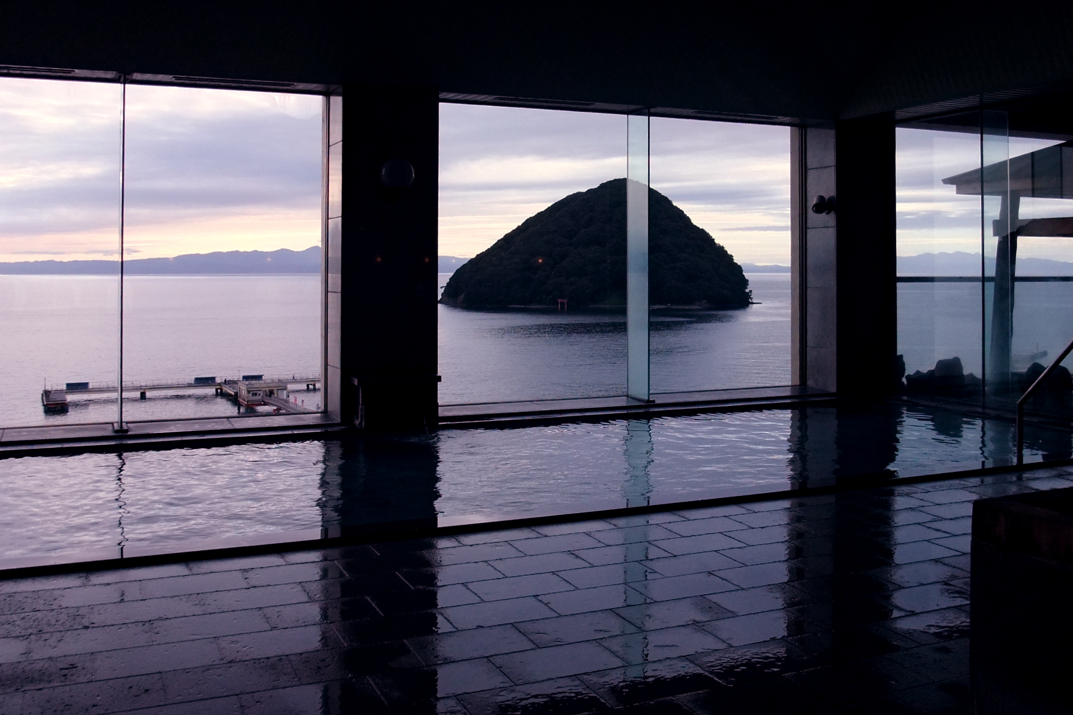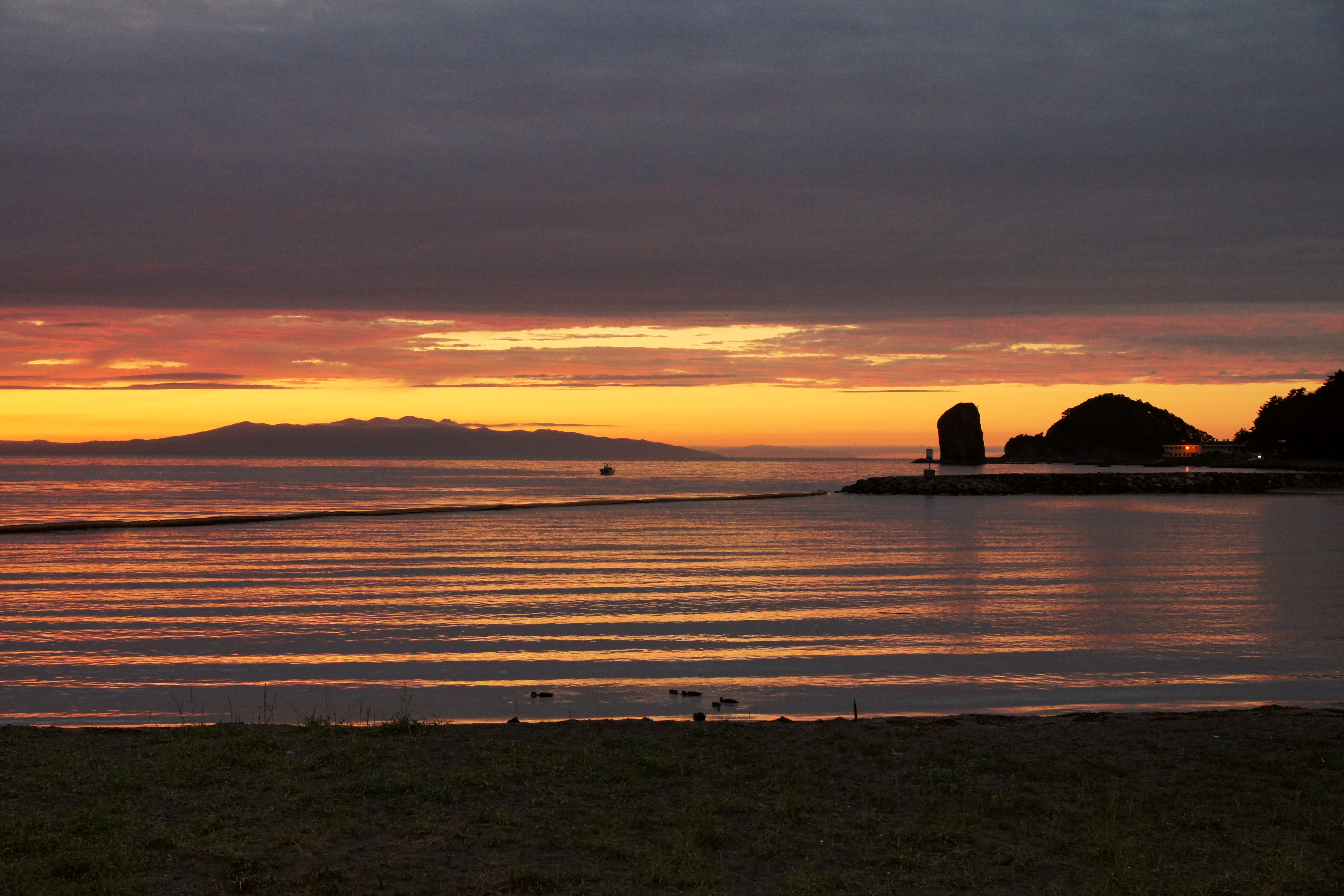 해안의 저녁 풍경. 오른쪽에 우뚝 솟은 것이 나키지마(裸島)이다.