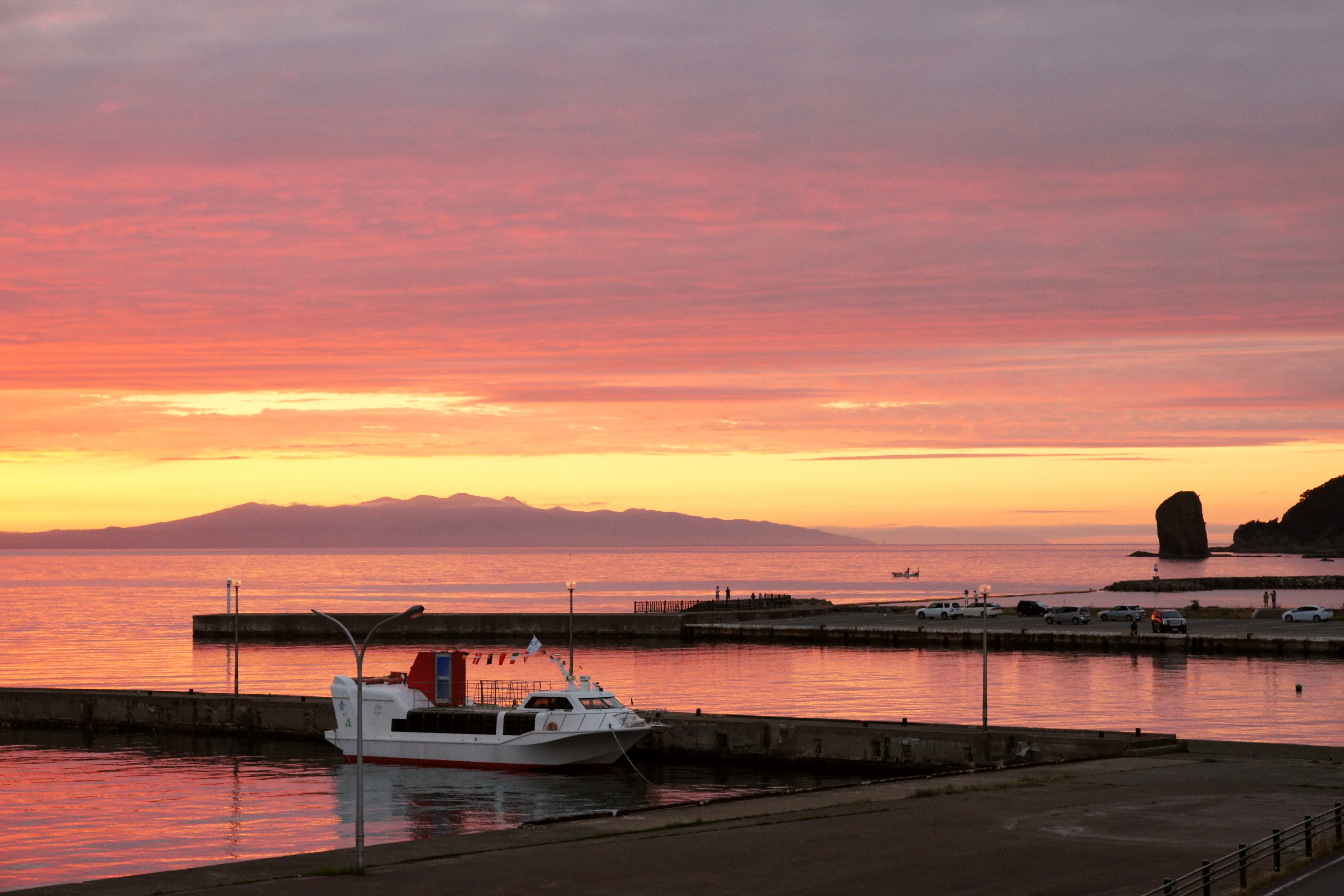 항구의 저녁 풍경. 뒤편에는 나체섬(裸島)이 보인다.