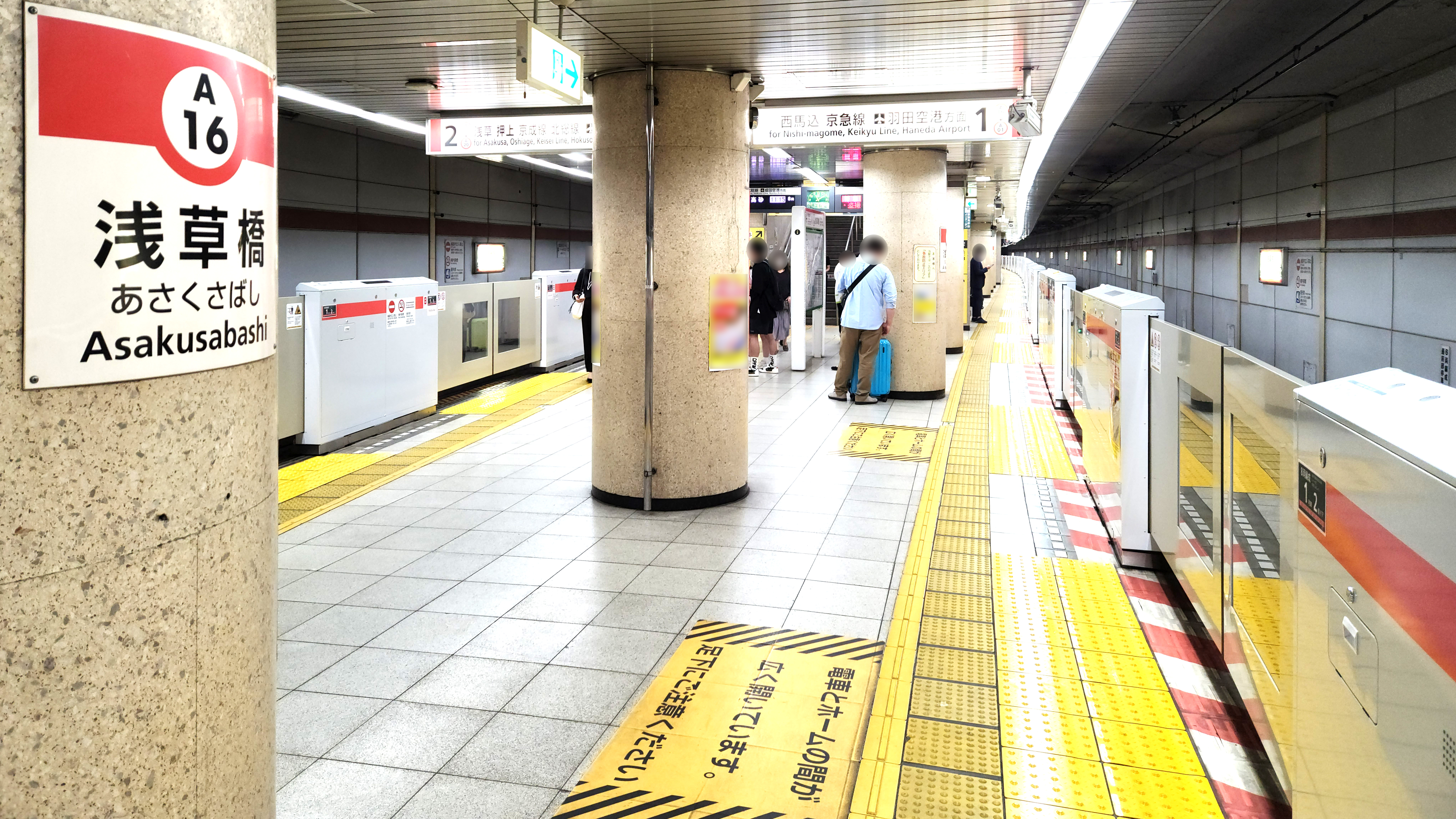 아사쿠사 선 역은 지하에 섬식 승강장 1면 2선을 갖추고 있다. 1번 승강장은 니혼바시, 센가쿠지, 니시마고메 방면(게이큐 선), 2번 승강장은 아사쿠사, 오시아게 방면(호쿠소 선, 게이세이 본선, 게이세이 나리타 공항선) 열차가 출발한다.[22] 승강장 층과 개찰 층 사이에는 에스컬레이터와 엘리베이터가 설치되어 있다.[23]승강장 번호 노선 행선지 1 -- 도영 지하철 아사쿠사 선 니혼바시·센가쿠지·니시마고메·시나가와·하네다 공항·미사키구치 방면