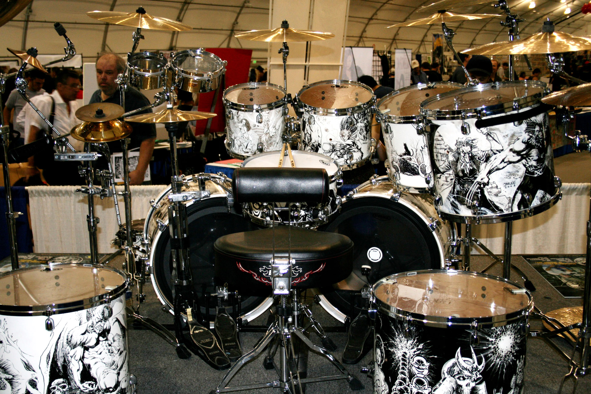 2000년대 초, 애덤스는 코믹북 수집가이자 판매상인 시스템 오브 어 다운 드러머 존 돌마얀이 사용하는 드럼 키트의 삽화를 의뢰받았다. 돌마얀은 거대한 여자들이 로봇과 고질라와 싸우는 장면을 한 드럼에 그리는 것을 의뢰했고, 다른 드럼에는 Simon Bisley, Kevin Eastman, Tim Vigil이 다른 캐릭터와 장면을 묘사한 그림을 그렸다.[30]