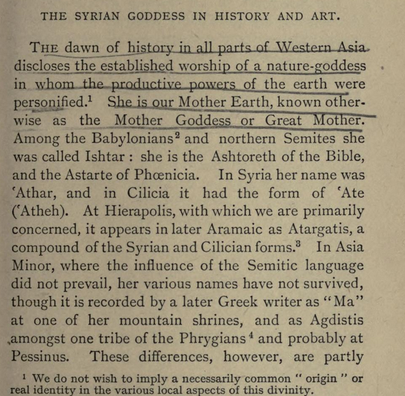- '''가나안''': 구약성서에는 '아세라'라는 이름으로 등장하며, 풍요의 신 바알의 아내로 여겨져 숭배되었다. 초기 히브리인들은 이 여신을 적대시했지만,[72] 가나안 땅에 정착하면서 숭배하기 시작했고,[73] 성산이라 불리는 가나안식 예배소에서 섬겼다. 히브리인들이 아세라 숭배를 적대시한 이유는 풍요 기원을 명목으로 한 매춘 행위와 관련이 있었기 때문이다.[68]