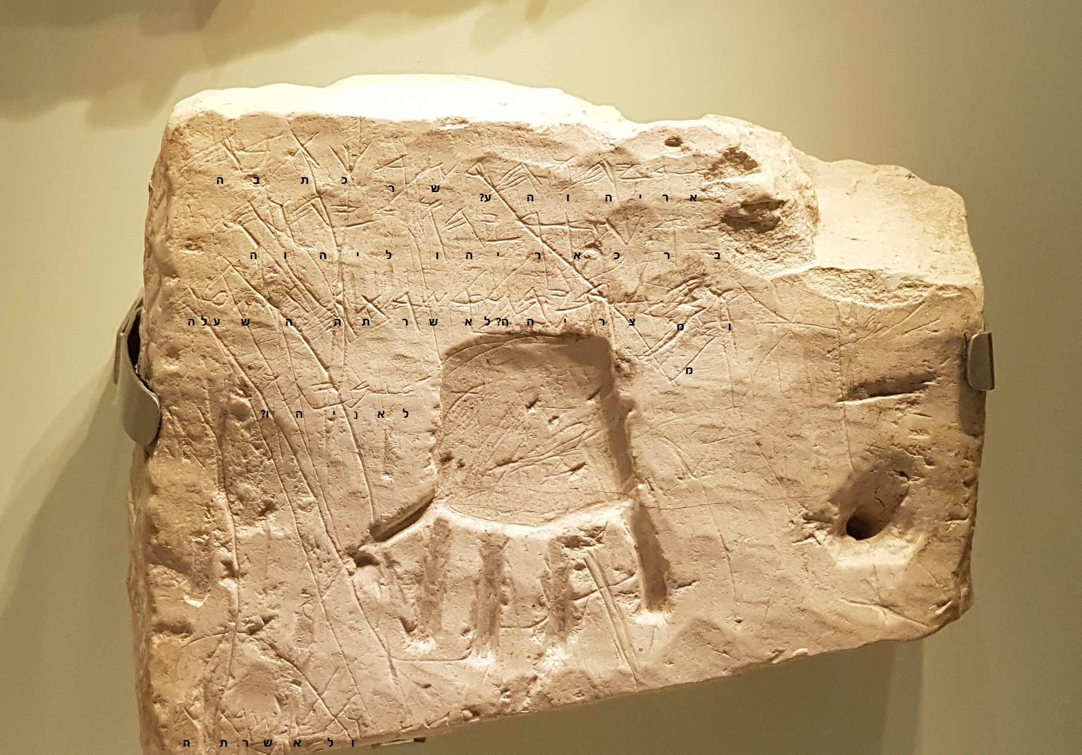 히르벳 엘쿰과 쿤틸렛 아주드에서 발견된 비문과 상징들은 아세라 숭배 가능성을 보여주는 증거로 제시된다.[39][40] 쿤틸렛 아주드에서 발견된 항아리에는 소 형상의 인간형 그림과 "사마리아의 야훼와 그의 아세라", "테만의 야훼와 그의 아세라"를 언급하는 여러 비문이 새겨져 있다.[41]그러나 많은 학자들은 비문에 언급된 "아세라"가 여신이 아니라 종교적 물체, 상징, 성소, 성스러운 나무 또는 숲을 가리킨다고 주장한다.[42][43][44]