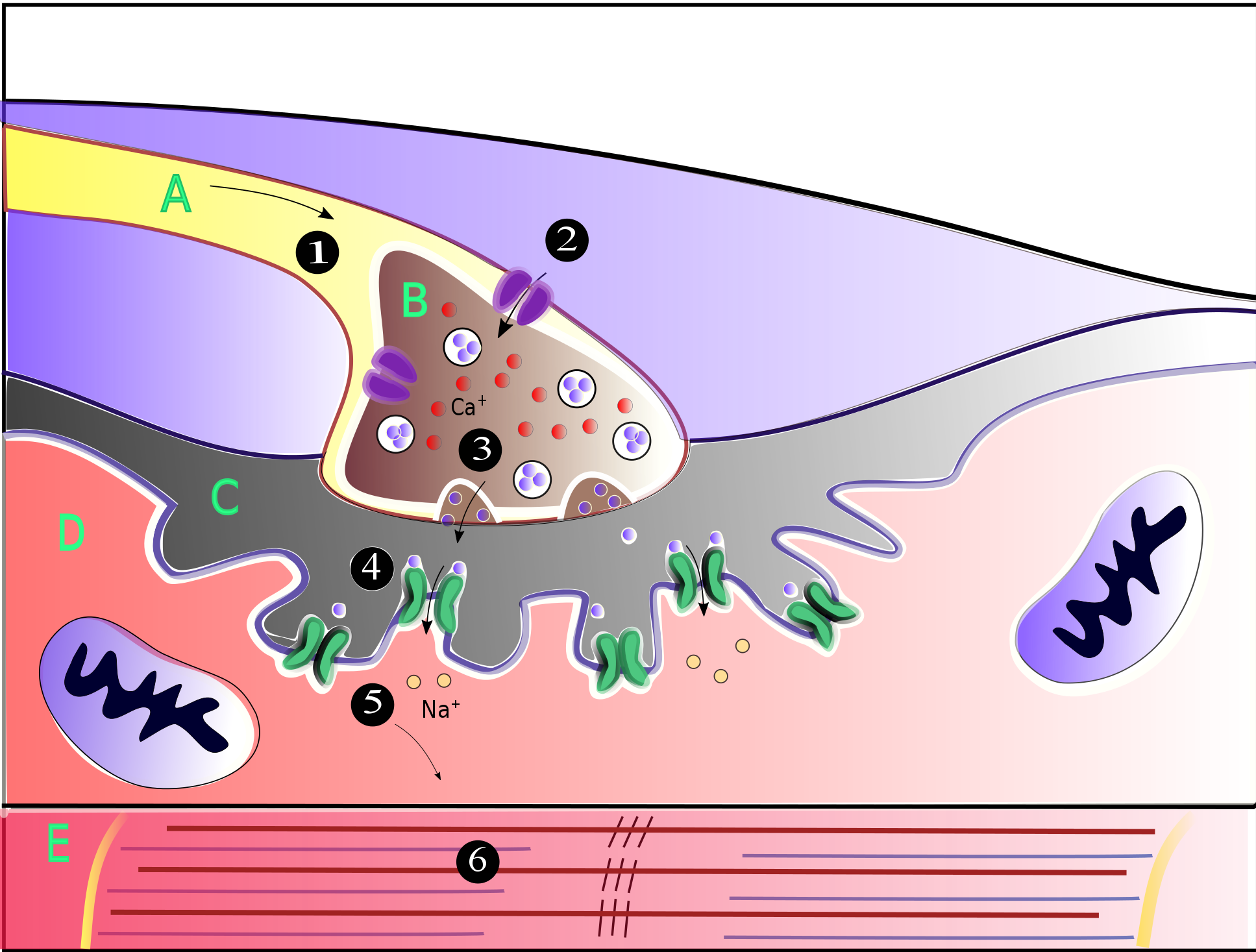 운동 뉴런에서 활동 전위가 발생하면, 이 신호는 신경을 따라 빠르게 이동하여 신경근 접합부에 도달한다. 이곳에서 전기화학적 과정을 통해 아세틸콜린이 시냅스 전 종말과 근육 섬유 사이의 공간(시냅스 틈새)으로 방출된다.
