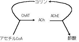 아세틸콜린은 특정 뉴런 내에서 효소인 콜린 아세틸전이효소(ChAT)에 의해 콜린과 아세틸-CoA를 재료로 하여 합성된다.[10][11] 이렇게 생성된 아세틸콜린은 신경 말단에서 방출되어 신호를 전달한 후, 시냅스 틈새에 존재하는 아세틸콜린에스터레이스(AChE)라는 효소에 의해 콜린과 아세테이트로 신속하게 분해된다. 이 분해 과정은 신호 전달을 종료시키고 다음 신호를 준비하는 데 필수적이다.
