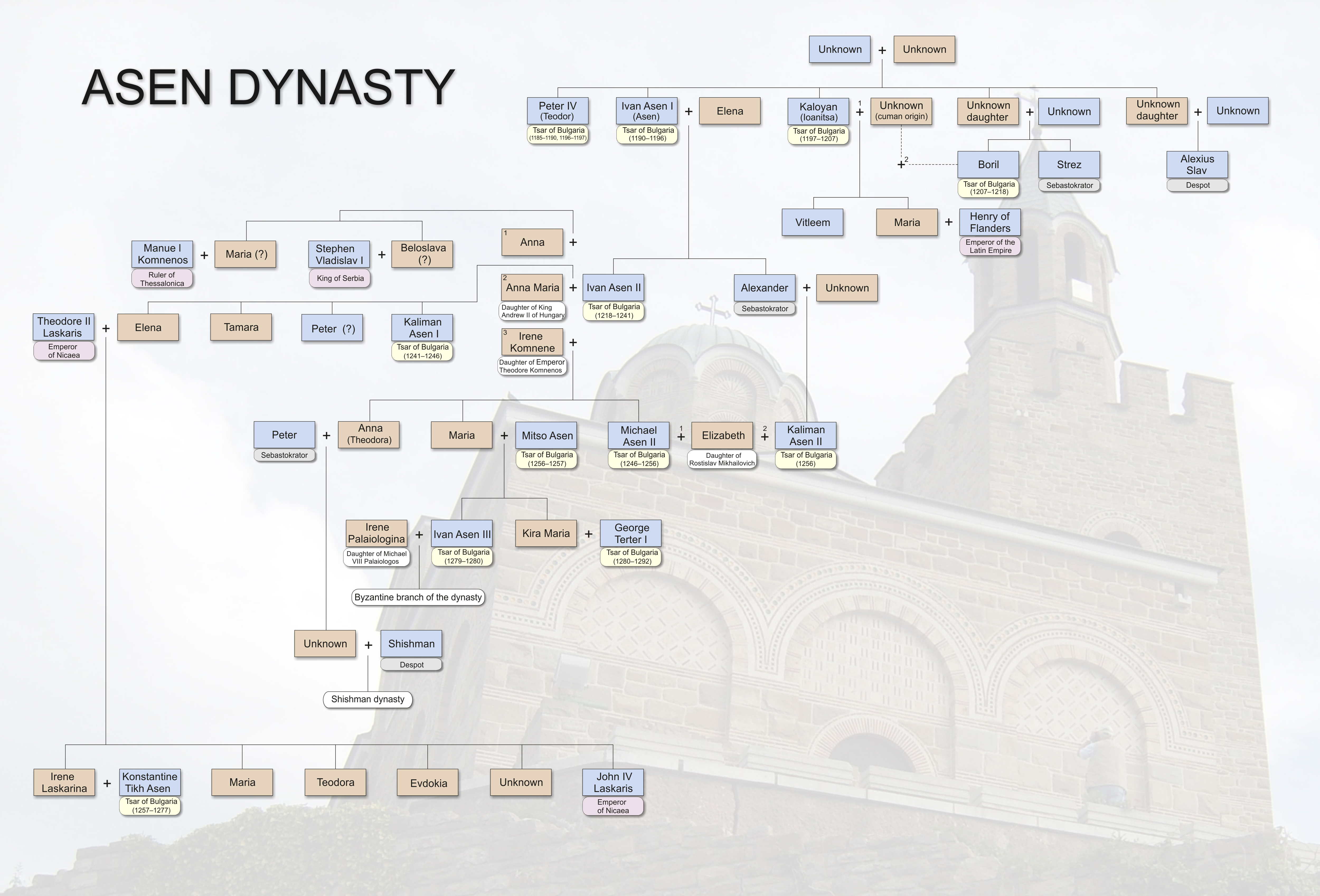 아센 왕조는 12세기 말 불가리아에서 시작된 왕조로, 페터르 4세, 이반 아센 1세, 칼로얀 3형제가 이 왕조의 기틀을 다졌다. 이들의 민족적 기원은 논쟁의 대상이며, 쿠만인, 불가리아인, 왈라키아인 기원설이 존재한다. 왕조의 이름은 창건자인 이반 아센 1세의 이름에서 유래되었으며, 그의 별명 '벨군'은 튀르크어에서 유래되었다. 아센 왕조는 불가리아 제2제국을 건설했으며, 비잔틴 제국으로도 분가하여 팔레올로고스 왕조 등 유력 가문과 혼인 관계를 맺었다.
