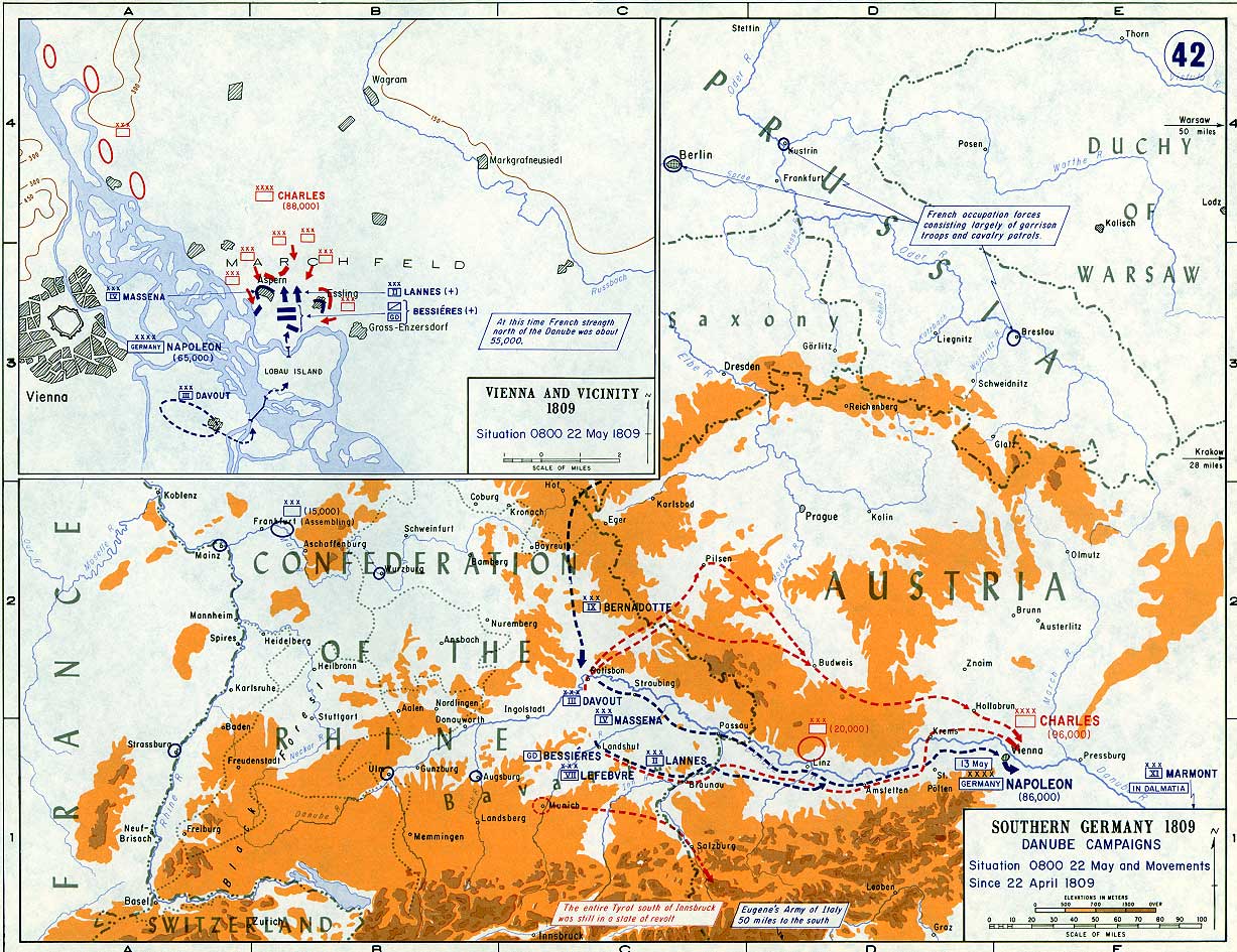 프랑스군은 도나우강 도하를 시도했으나 슈바르체 라케나우 전투에서 첫 번째 시도는 실패했다. 이후 로바우 섬을 다음 도하 지점으로 선택하여 신중한 준비 끝에 5월 19일과 20일 밤, 로바우로 가는 모든 수로에 다리를 놓고 섬을 점령했다. 20일 저녁까지 많은 병력이 집결했고, 앙드레 마세나의 군단이 즉시 왼쪽 둑으로 건너가 오스트리아 전초 기지를 몰아냈다. 티롤 백국과 보헤미아로부터의 후방 공격 소식에도 불구하고, 나폴레옹은 21일 25,000명의 병력을 바그람 전투의 무대가 될 마르히펠트에 집결시켰다.[4]