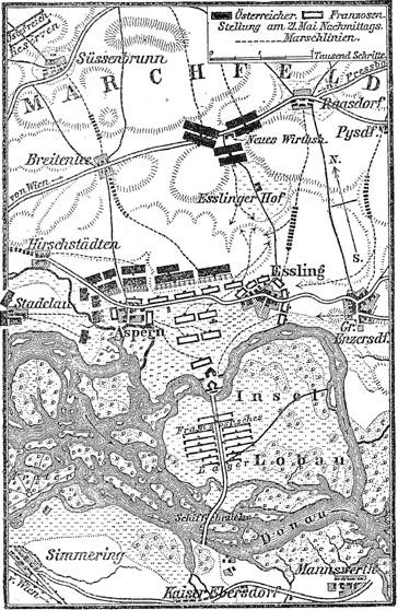 카를 대공은 도하를 막지 않고, 충분한 병력이 건너오면 나머지 프랑스군이 지원하기 전에 공격할 계획이었다.[4] 나폴레옹은 이러한 위험을 감수하면서도 가능한 모든 부대를 소집하려 했다. 마르히펠트의 프랑스군은 다리 앞에 북쪽을 향해 배치되었고, 왼쪽은 아스페른(대아스페른), 오른쪽은 에슬링에 있었다. 두 곳 모두 도나우강과 가까워 포위될 수 없었다. 프랑스군은 마을 사이의 간격을 메우고, 지원 부대가 대형을 갖출 공간을 마련하기 위해 앞으로 이동해야 했다.[4]