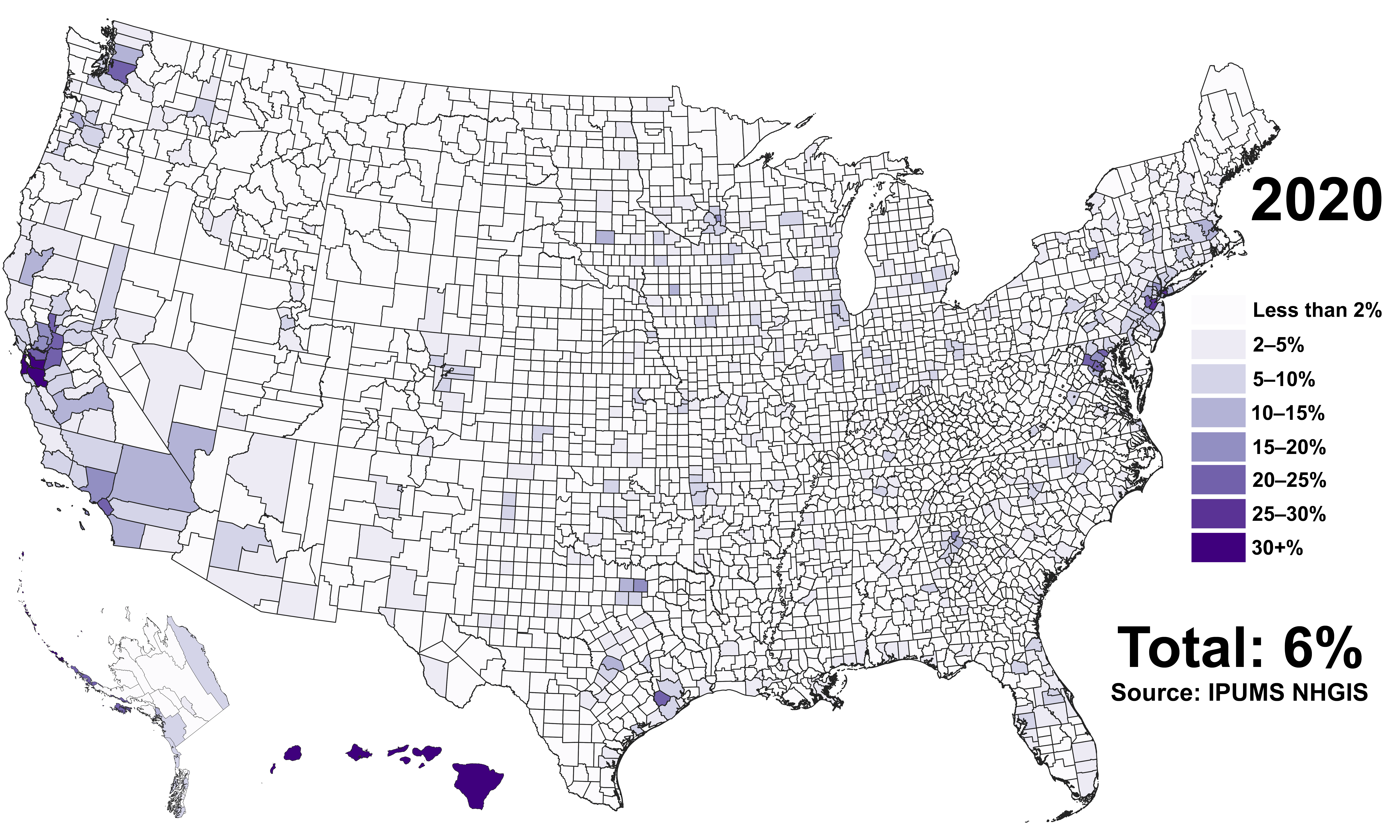 1990년 인구 조사에서는 "아시아인 또는 태평양 섬 주민(API)"이 명시적 범주로 포함되었지만, 응답자는 하위 범주로 특정 혈통을 선택해야 했다.[37] 2000년 인구 조사부터는 "아시아계 미국인"과 "원주민 하와이인 및 기타 태평양 섬 주민"의 두 가지 별도 범주가 사용되었다.[38]