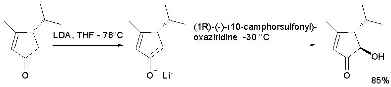 아래의 사이클로펜타디에논[5]의 엔올 산화 반응에서, 캠퍼 이성질체를 사용하면, ''트랜스'' 이성질체가 얻어진다. 이는 ''시스'' 위치의 수산기 접근이 제한되기 때문이다. 일반적인 옥사지리딘을 사용한 경우에는 아실로인 생성이 일어나지 않았다.