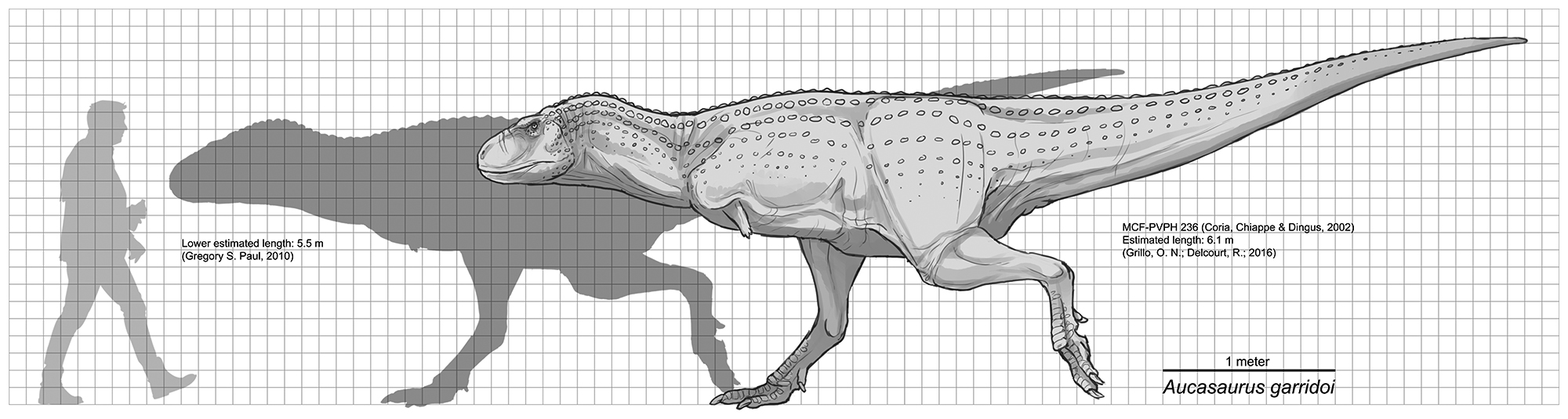 2009년, 노바스는 ''아우카사우루스 가리도이''가 ''아벨리사우루스 코마우헨시스''의 주니어 동의어일 수 있다고 제안했다.[10] 2010년, 그레고리 S. 폴은 ''아우카사우루스 가리도이''를 ''아벨리사우루스 가리도이''로 재명명했다.[11] 유사성에도 불구하고, 다른 연구자들은 두 속을 별개의 속으로 분류했으며, 후속 연구는 ''아우카사우루스''가 ''카르노타우루스''와 같은 다른 분류군과 더 밀접한 관련이 있다고 제안했다.[12] 일부는 이를 카르노타우루스족에 포함시키기도 한다.[13][15][14]