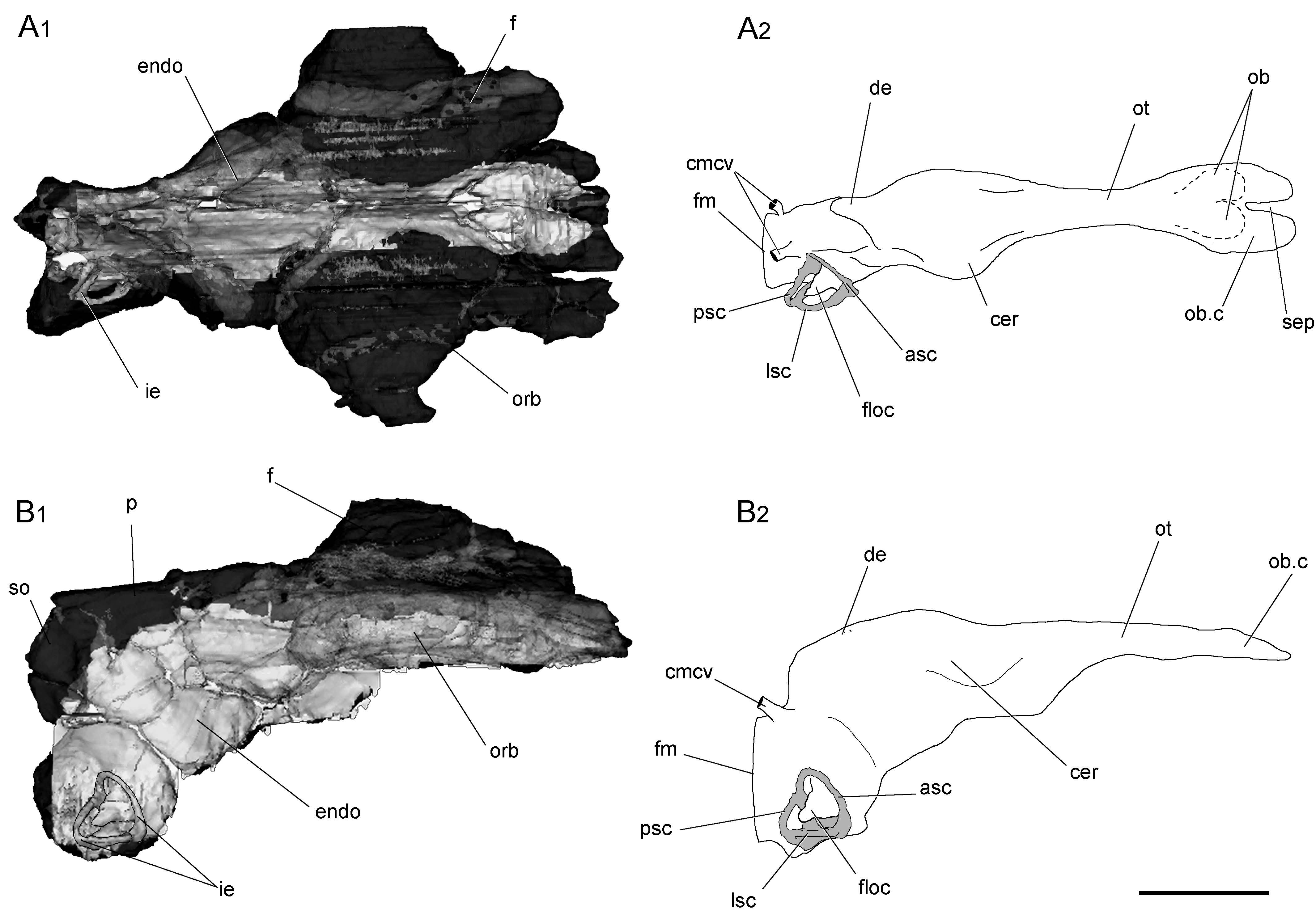 2015년 아리아나 폴리나-카라바할(Ariana Paulina-Carabajal)과 세실리아 수카르(Cecilia Succar)는 아우카사우루스(''Aucasaurus'')의 뇌 상자에 대한 연구를 수행했다. 이 연구에서 두개골 재료는 의료용 CT 기계를 사용하여 스캔되었고, 가상 3차원 내이 및 두개 내강 주형이 앨버타 대학교(University of Alberta)의 이미지 소프트웨어를 사용하여 획득 및 시각화되었다. 또한 라텍스 두개 내강 주형이 제작되었다.[8]