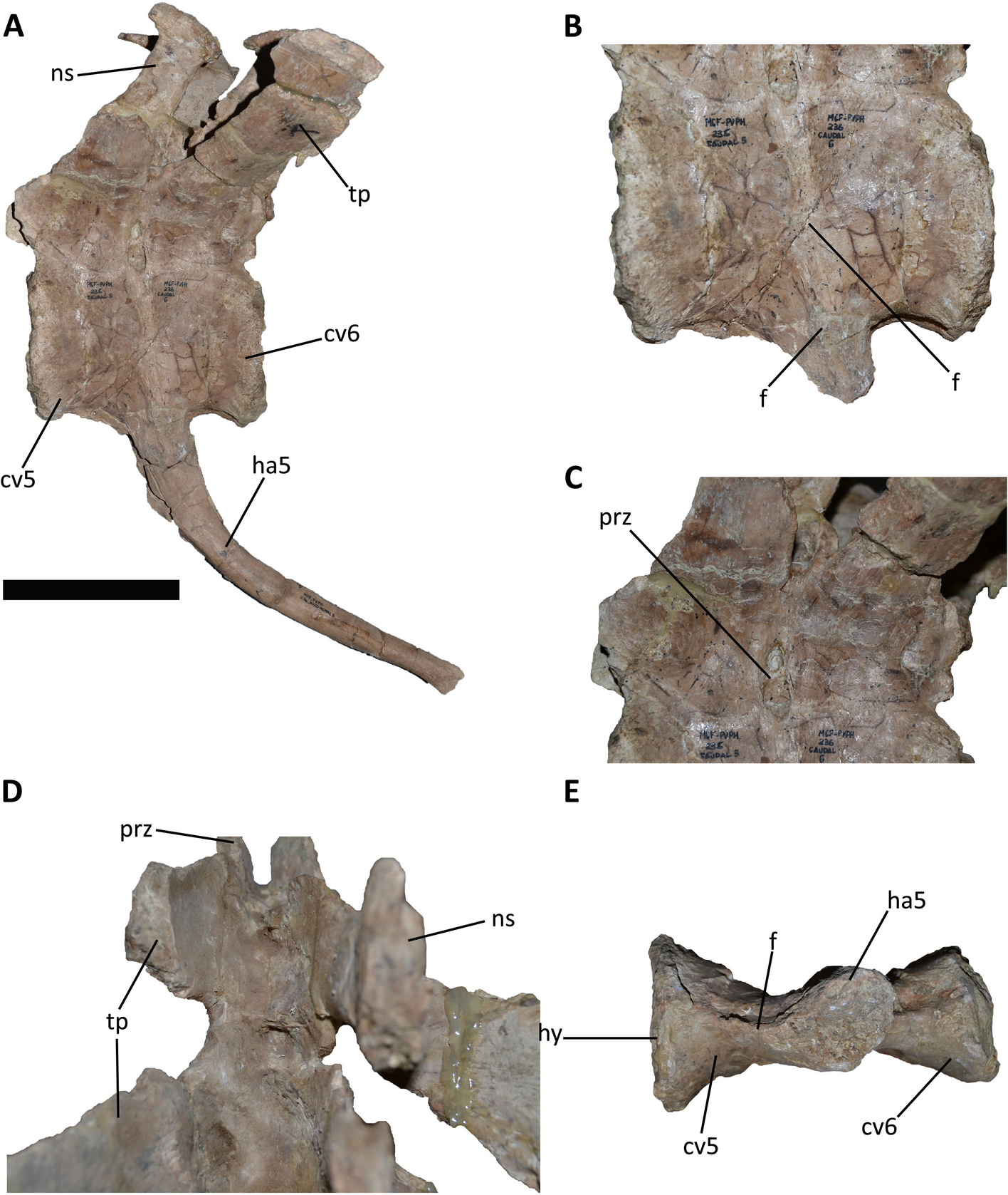 아우카사우루스의 5번째와 6번째 모식 꼬리 척추는 발달 과정에서 척추 분절이 실패했음을 보여주며, 이로 인해 두 척추가 융합되었다. Baiano 등(2024)은 이를 선천적 장애인 블록 척추라고 해석했다. 이는 비조류 수각류 화석 기록에서 알려진 가장 오래된 이 병리학적 사례이다.[9]
