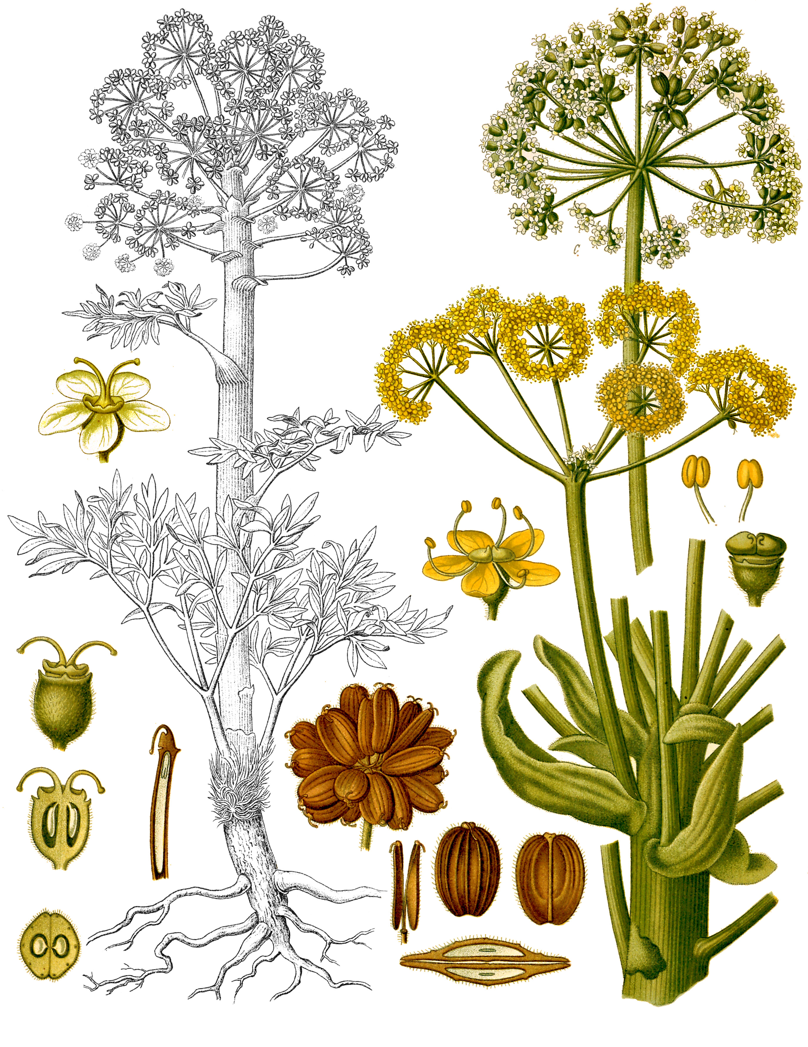 로마 시대의 향신료 실피움은 멸종되었거나, ''Ferula tingitana''를 포함한 ''Ferula'' 종에서 유래했을 가능성이 있지만, 다른 정체성에 대한 제안도 있었다. 로마인들은 이 식물로 만든 속이 빈 가벼운 막대기를 ''ferula''라고 불렀으며, 이러한 막대기는 지팡이, 부목, 끓는 액체를 젓는 데, 그리고 체벌에 사용되었다. 많은 ''Ferula'' 종의 고무 수지는 다양한 용도로 사용된다.''Ferula foetida'', ''Ferula assa-foetida'' 및 기타 일부 종은 향신료 아사페티다(hing)를 만드는 데 사용된다. [6] ''Ferula gummosa''는 갈바넘을 만든다. ''Ferula hermonis''는 잘루를 만든다. ''Ferula moschata''는 숨불을 만든다. ''Ferula persica'' 또는 ''F. szowitziana''는 사가페넘을 만든다. ''Ferula marmarica''는 "키레네 암모니아쿰"을 만든다. ''Ferula ammoniacum''은 "페르시아 암모니아쿰"을 만든다. ''Ferula communis'' subsp. ''brevifolia''는 "모로코 암모니아쿰"을 만든다.