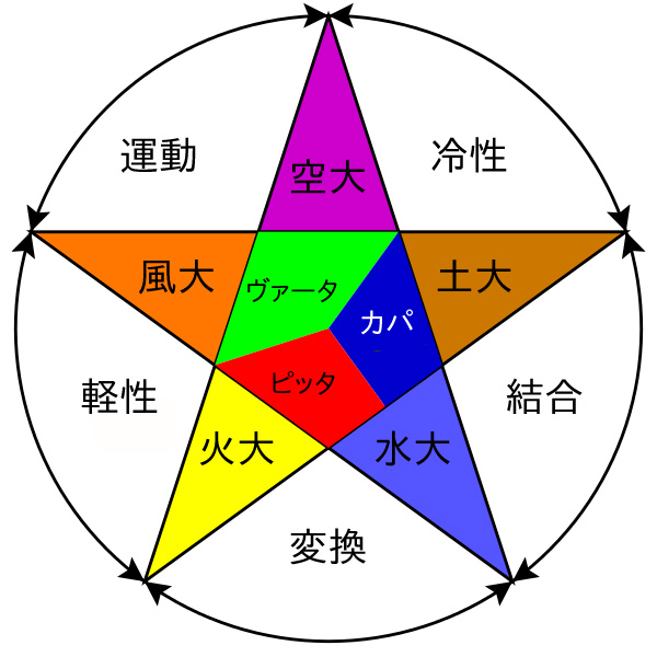 트리・도샤(삼체액)와 오대(판차 마하부타)의 관계 (사용된 색상은 임의)