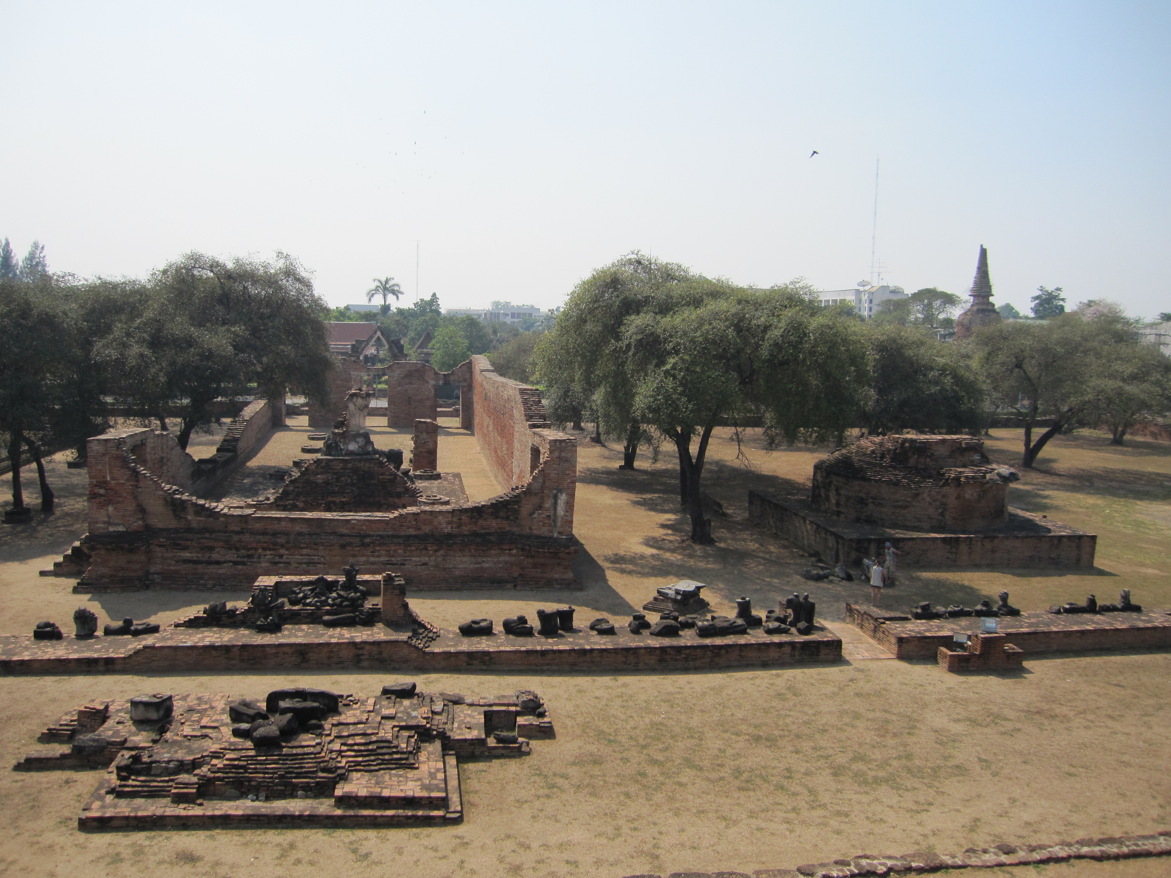 1351년부터 1767년까지 존속했던 아유타야 왕조는 현재의 라오스, 캄보디아, 미얀마 일부를 영토로 할 만큼 강력한 세력을 가졌다.[11] 중심 도시 아유타야는 유속이 완만한 차오프라야강에 위치하여 무역에 적합했으며, 왕은 이러한 지리적 이점을 활용, 독점 무역으로 막대한 이익을 얻었다.[11] 또한 상좌부 불교를 신봉했던 왕은 이 이익을 바탕으로 수많은 사원(왓)을 건설했다.[11]2. 3. 멸망과 폐허 (1767년)