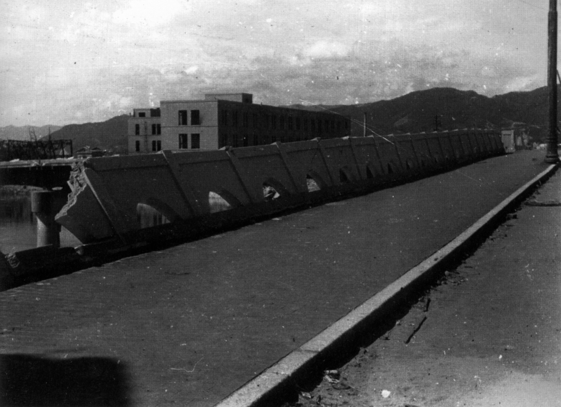 피해 | 주형 상부에 정착되어 있었기 때문에 이동은 없었지만, 무수한 균열이 발생했다. 전차 운전 재개 후에는 진동으로 인해 균열이 더욱 진행되었다。 |