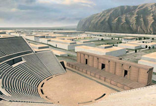 - 직경 84m의 원형 극장이 있었다. 좌석은 35열이며, 4천 명에서 6천 명을 수용 가능했다. 지배자를 위한 3개의 특별석이 있었다. 동시대의 다른 원형 극장과 비교하면, 바빌론의 것보다 크고, 에피다우로스의 것보다 약간 작다.