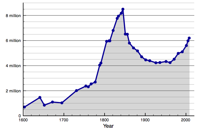 인구 변화 | 1841년 820만 명에서 1851년 650만 명으로 급감, 이후 1961년까지 450만 명으로 지속적인 감소 |