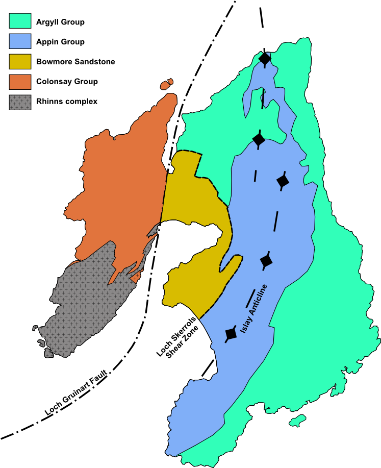 Loch Indaal은 그레이트 글렌 단층의 지류인 Loch Gruinart 단층을 따라 형성되었으며, 주요 선은 콜론세이 바로 북쪽을 지난다. 이로 인해 석회암, 화성암 관입 및 보모어 사암이 린스의 콜론세이 그룹 암석과 분리된다.[39] 그 결과 가끔 작은 지진이 발생한다.[40]