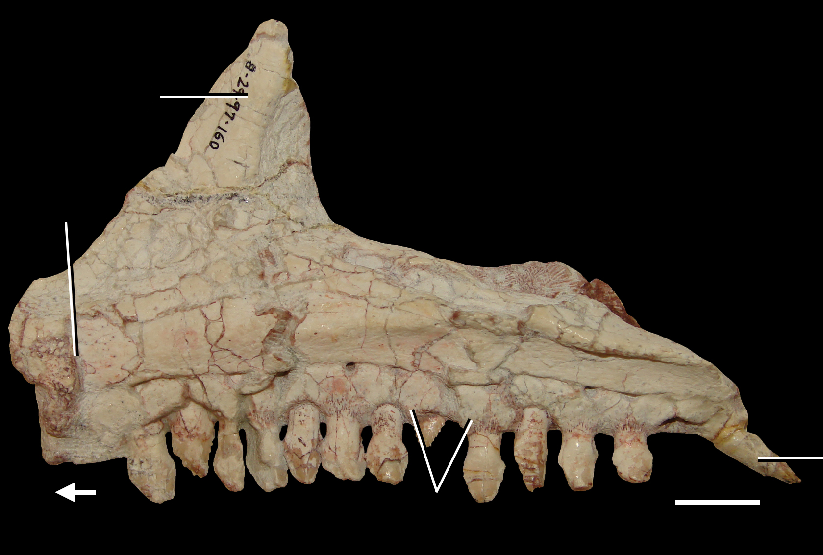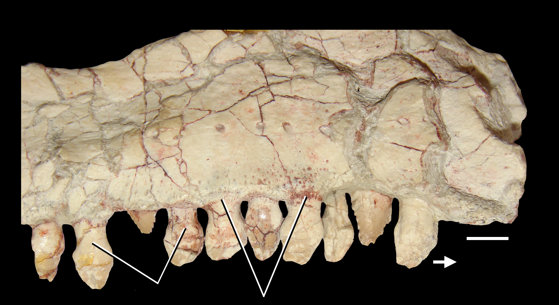 구개 치아를 가진 ''A. madagaskarensis''의 오른쪽 구개골의 안쪽 모습