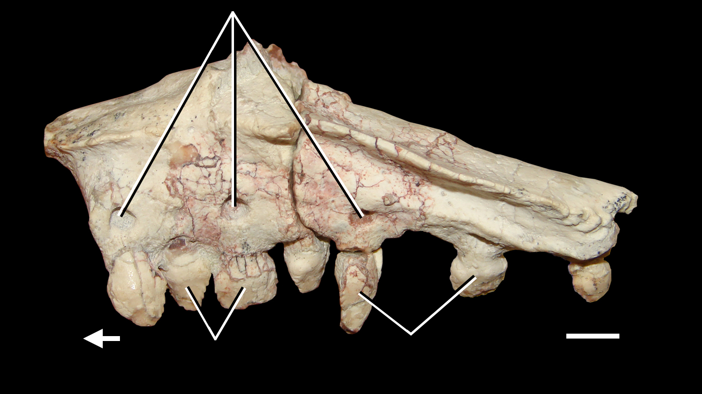 ''A. 마다가스카리엔시스''의 오른쪽 상악골의 내측면, 뒷부분에 있는 용골을 보여줌