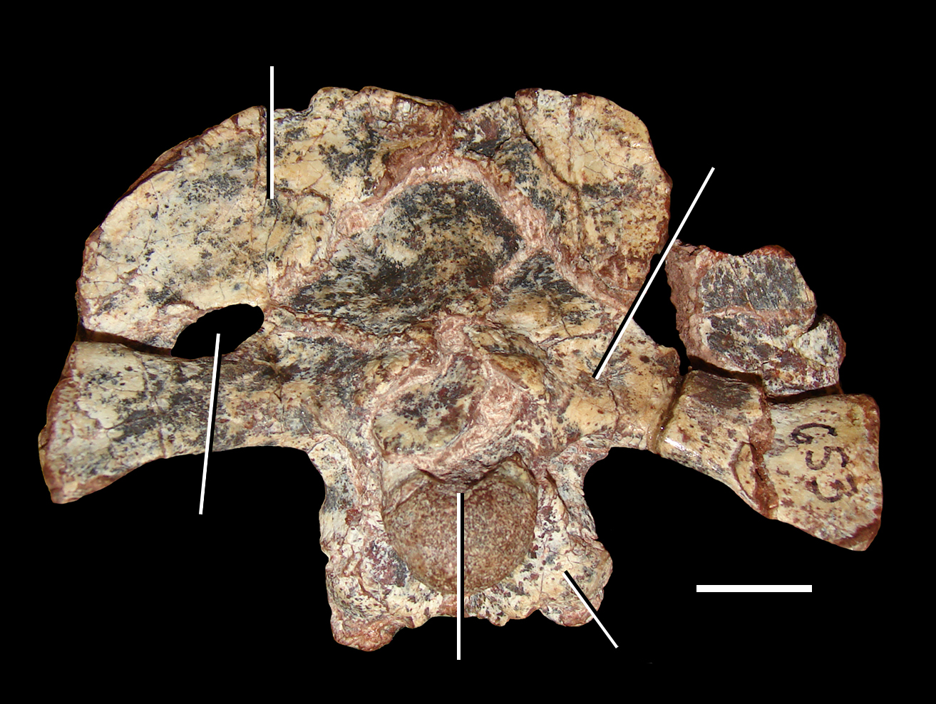 경추의 형태는 목 아래쪽으로 변하며 특징적으로 길고 낮은 신경 극이 길어지고 목 아래쪽으로 점차 길이가 짧아지지만, 점점 더 크고 좁은 신경 극이 생기게 된다. 이 단축은 ''트릴로포사우루스''와 같은 다른 알로코토사우리아의 목에서는 볼 수 있지만 다른 긴 목의 대퇴부(예: 가운데 자궁경부는 타니스트로페이드에서 가장 길다)에서는 볼 수 없다. 목은 몸 위로 올려져 있었을 것인데 이는 각 척추뼈를 연결하는 지가포피스의 기울어진 각도로 나타내며 각 척추뼈의 앞쪽 지가포피가 뒤쪽에 있는 것보다 더 높았다는 것이다. 목은 또한 이 위치의 관절형 경추 세트에 기초하여 완만한 호로 고정되었을 가능성이 있다.[2]