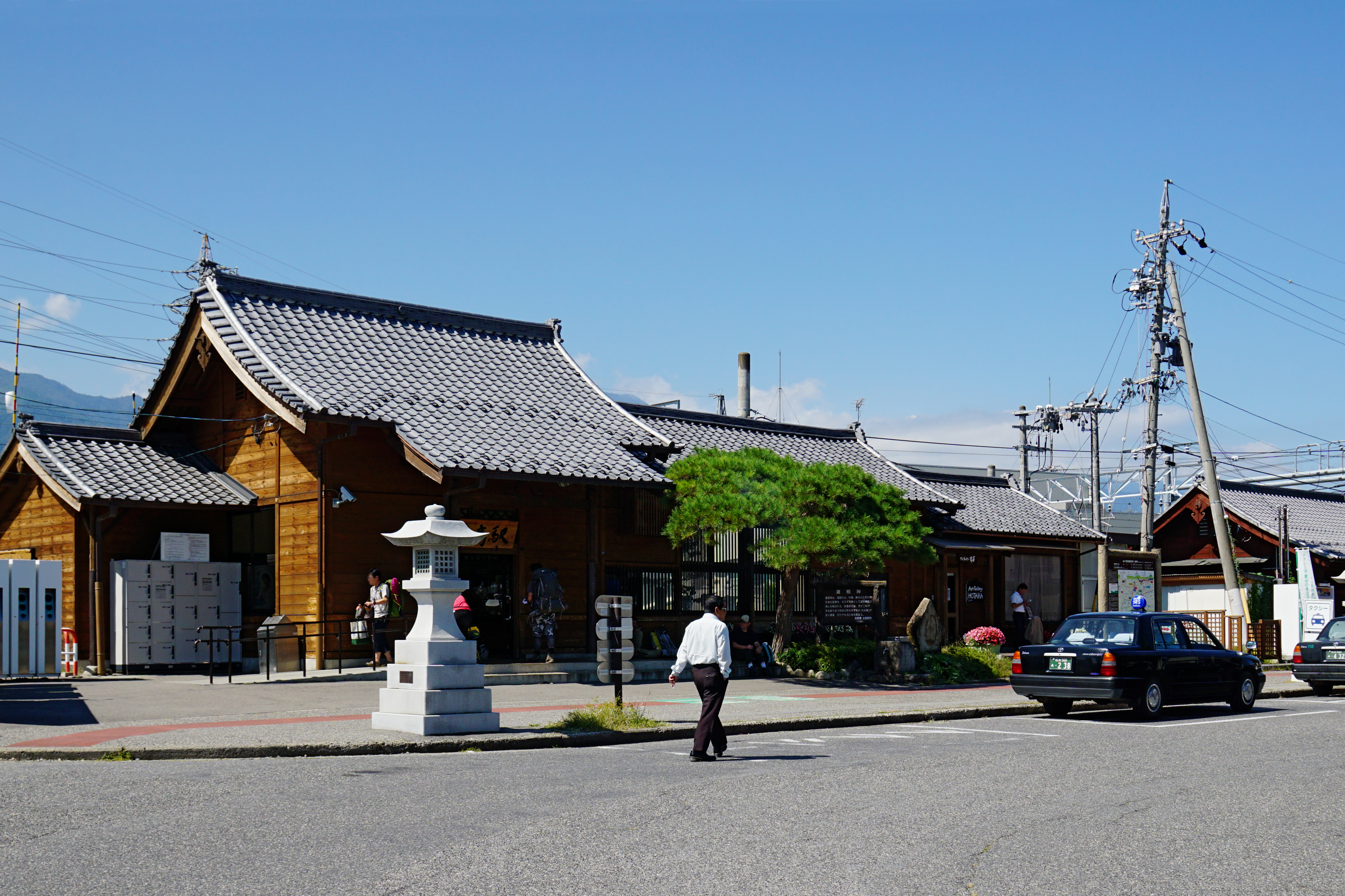 동일본 여객철도(JR 동일본) 오이토선 및 시노노이선이 지난다. 오이토선은 아즈사바시 역, 히토이치바 역, 나카가야 역, 미나미토요시나 역, 도요시나 역, 하쿠야초 역, 호타카 역, 아리아케 역, 아즈미오이와케 역을 지난다. 시노노이선은 타자와 역과 아카시나 역을 지난다.