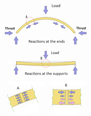 아치는 솟아오름으로 인해 수직 하중을 양 끝단의 수평 및 수직 반력으로 분해하는데, 이를 '''아치 작용'''이라고 한다. 수직 하중은 아치에 긍정적인 굽힘 모멘트를 발생시키고, 덧대기/받침대에서 작용하는 안쪽 방향의 수평 반력은 균형을 이루는 부정적 모멘트를 제공한다. 결과적으로, 아치의 모든 세그먼트에서의 굽힘 모멘트는 등가 하중 및 경간을 가진 보보다 훨씬 작다.[3] 오른쪽 그림은 하중을 받는 아치와 보의 차이점을 보여준다. 아치의 요소는 주로 압축을 받지만(A), 보에는 굽힘 모멘트가 존재하며, 상단에는 압축, 하단에는 인장이 발생한다(B).