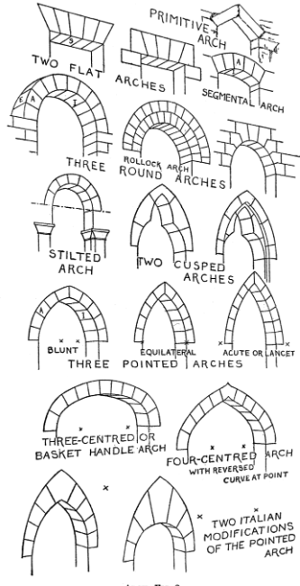 다양한 아치 형태(왼쪽)는 원형 아치, 뾰족 아치, 포물선 아치의 세 가지 범주로 분류할 수 있다.[9]