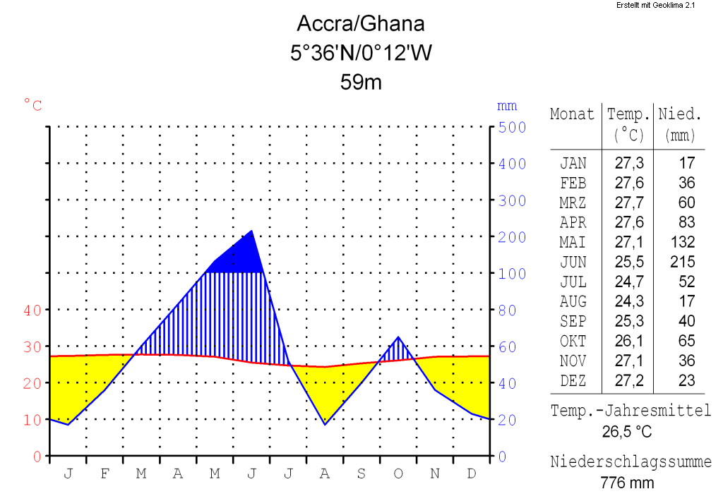 공기가 도시 위 주머니에 갇히는 경우가 많으며, 단열 효과로 인해 기온이 몇 도 상승할 수 있다. 이는 아크라 뉴타운 스포츠 단지 지역에서 가장 두드러지게 발생한다.