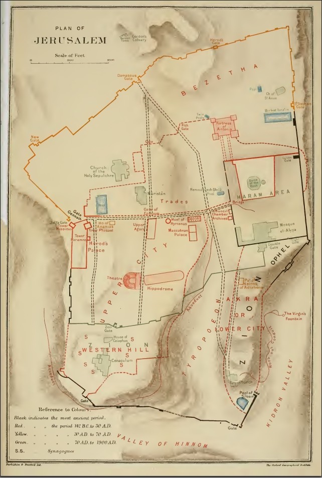 1903년 예루살렘 지도, 아크라(Acra)를 남동쪽 언덕 전체로 식별.
