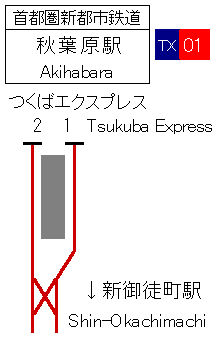 수도권 신도시 철도 쓰쿠바 익스프레스의 아키하바라역은 2005년 8월 24일에 개업했다.[28] 역 번호는 TX01이다.[28]