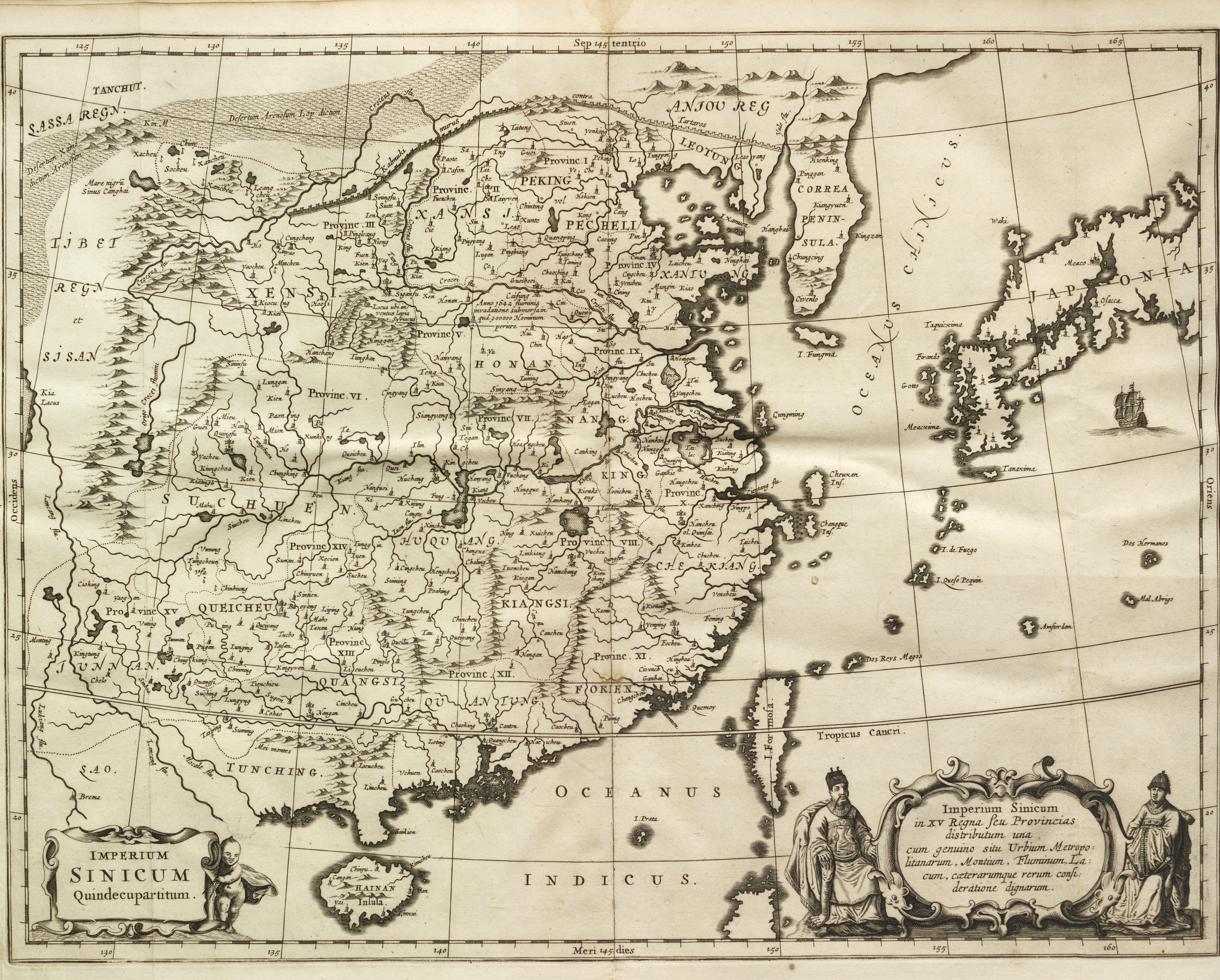 키르허는 1629년부터 중국에 관심을 갖고 선교사가 되기를 희망했다. 1667년에는 ''China Illustrata''(중국 삽화)를 출판하여 중국에 대한 폭넓은 연구를 선보였다. 이 책은 정확한 지도 제작법부터 용에 대한 연구와 같은 신화적 요소까지 다양한 내용을 담고 있으며, 미하엘 보이엠[52]과 마르티노 마르티니 등 예수회 선교사들의 보고서에 크게 의존했다. ''China Illustrata''는 중국 역사의 기독교적 요소를 강조하며, 네스토리우스 기독교의 초기 존재, 중국인이 함의 후손이라는 주장, 공자가 모세와 동일 인물이라는 주장, 한자가 추상화된 상형 문자라는 주장 등을 담고 있다. 키르허는 표의 문자가 상형 문자보다 우수하다고 보았지만, 마야와 아즈텍의 문자는 낮은 수준의 그림 문자로 간주했다. 움베르토 에코는 이러한 키르허의 견해가 유럽 중심적 사고방식을 반영한다고 지적했다.