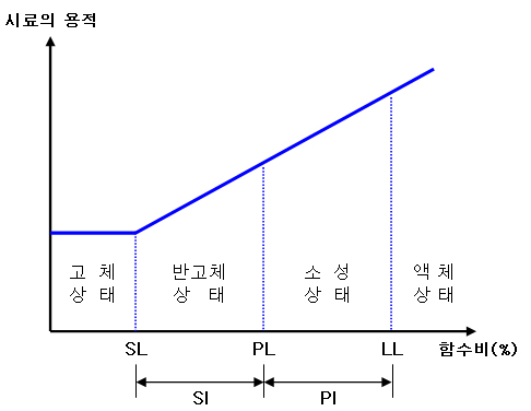 | 수축 한계 (SL) | 흙이 반고체 상태에서 고체 상태로 변하는 경계 함수비 |