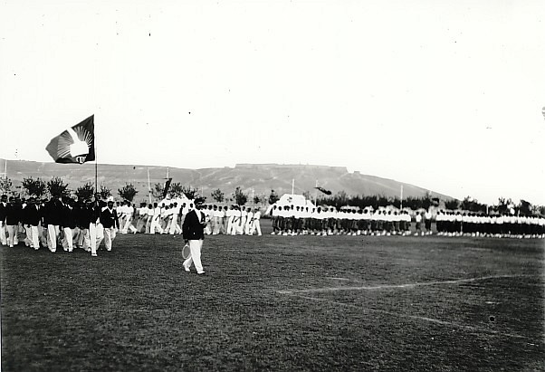 1930년대 차만에 호조리에서 선수들이 아프가니스탄 국가 올림픽 위원회 깃발을 따라 행진하고 있다.