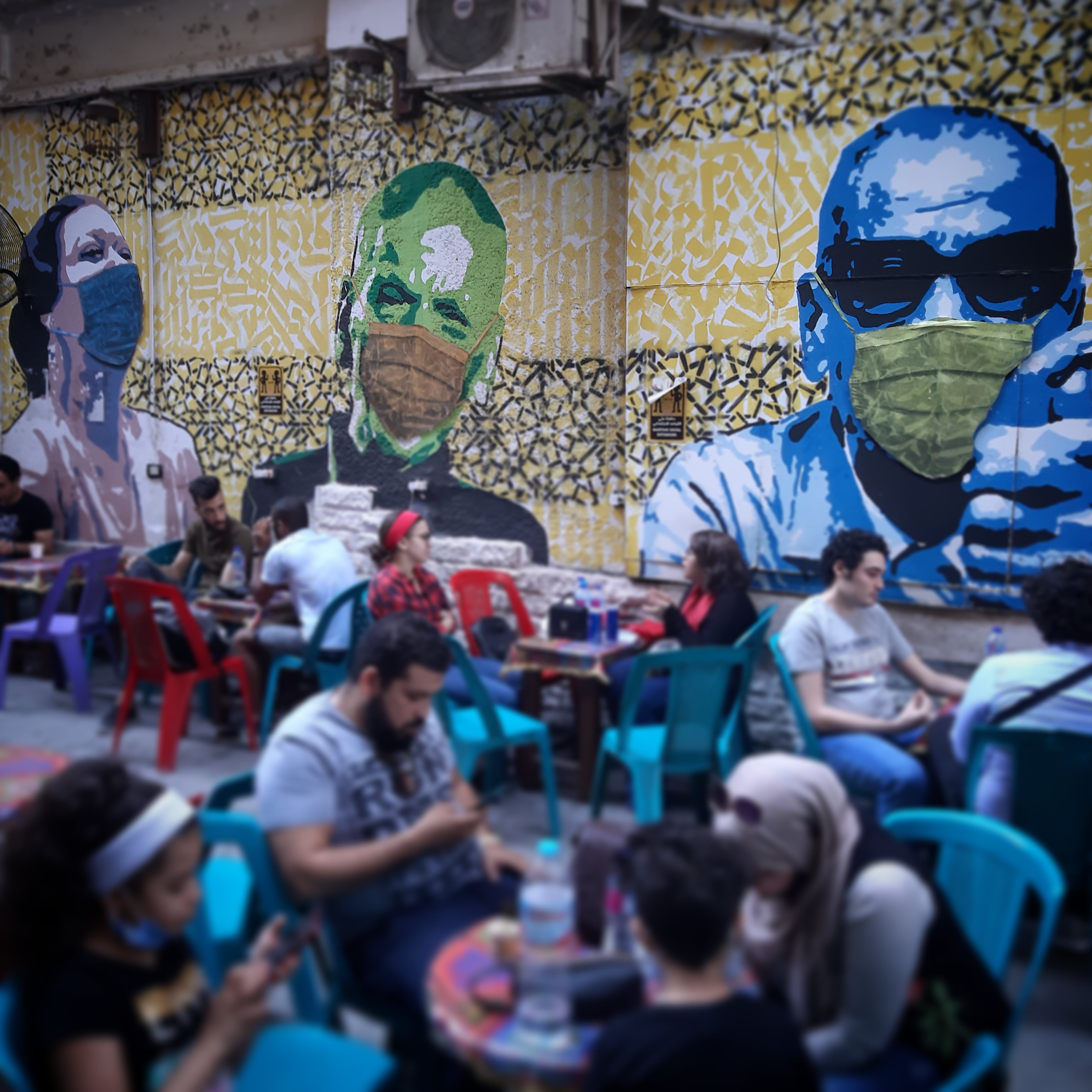 사람들이 2020년 8월 카이로의 한 카페에서 마스크를 쓴 사람들을 묘사한 벽화 앞에서 식사하고 있다