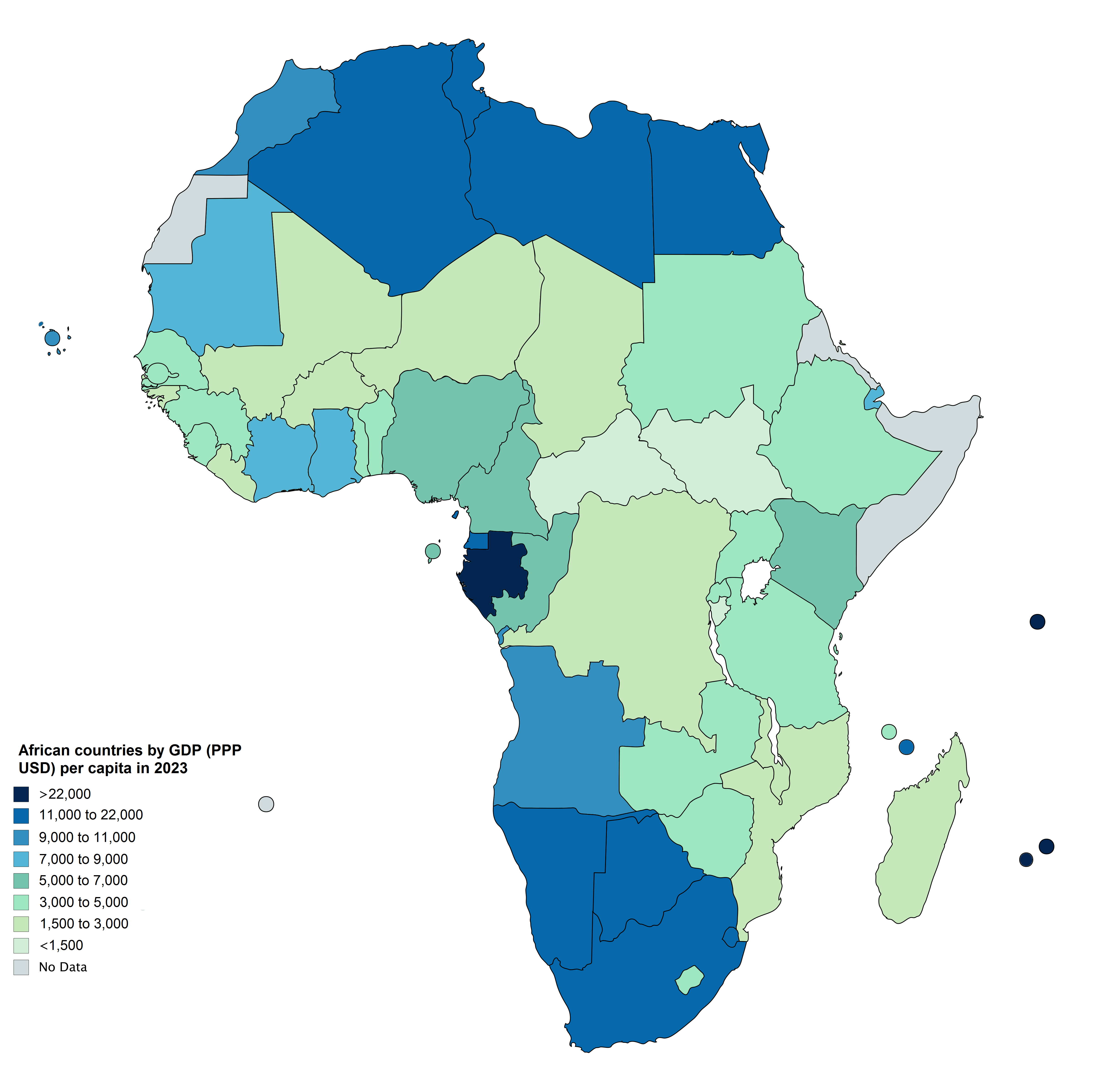 2018년 기준으로 나이지리아는 명목 GDP 기준 아프리카 최대 경제국이며, 그 뒤를 남아프리카 공화국이 잇고 있다. 구매력 평가 (PPP) 기준으로는 이집트가 나이지리아 다음으로 두 번째로 큰 경제 규모를 가지고 있다.[24] 1인당 GDP가 가장 높은 국가는 적도 기니이다. 알제리, 리비아, 가봉과 같은 석유 부국과 보츠와나와 같은 광물 부국들이 21세기 이후 상위 경제국으로 부상했다. 반면, 짐바브웨와 콩고 민주 공화국은 풍부한 천연자원을 보유하여 잠재적으로 세계에서 가장 부유한 국가 중 하나가 될 수 있음에도 불구하고, 만연한 정치 부패, 전쟁, 그리고 이민 문제로 인해 세계 최빈국 명단에 포함되어 있다. 보츠와나는 독립 이후 지속적이고 강력하며 안정적인 성장을 보여 주목할 만한 사례로 꼽힌다.[25][26]