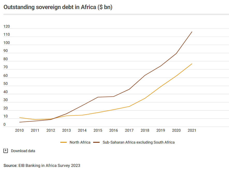 그러나 COVID-19 팬데믹은 아프리카 경제에 큰 타격을 주었다. 정부 수입 감소[30][31][32] 및 재정 적자 심화[37][43]로 많은 국가가 부채 위기에 직면했으며,[30][31][32] 경제 회복을 위한 각국의 경기 부양책 규모는 선진국에 비해 매우 작았다.[37][41][42] 팬데믹 상황에서도 민간 투자는 비교적 안정세를 유지했으나,[30] 특히 자원 의존도가 높은 국가들의 경제 회복은 더딜 것으로 전망된다.[47][48]