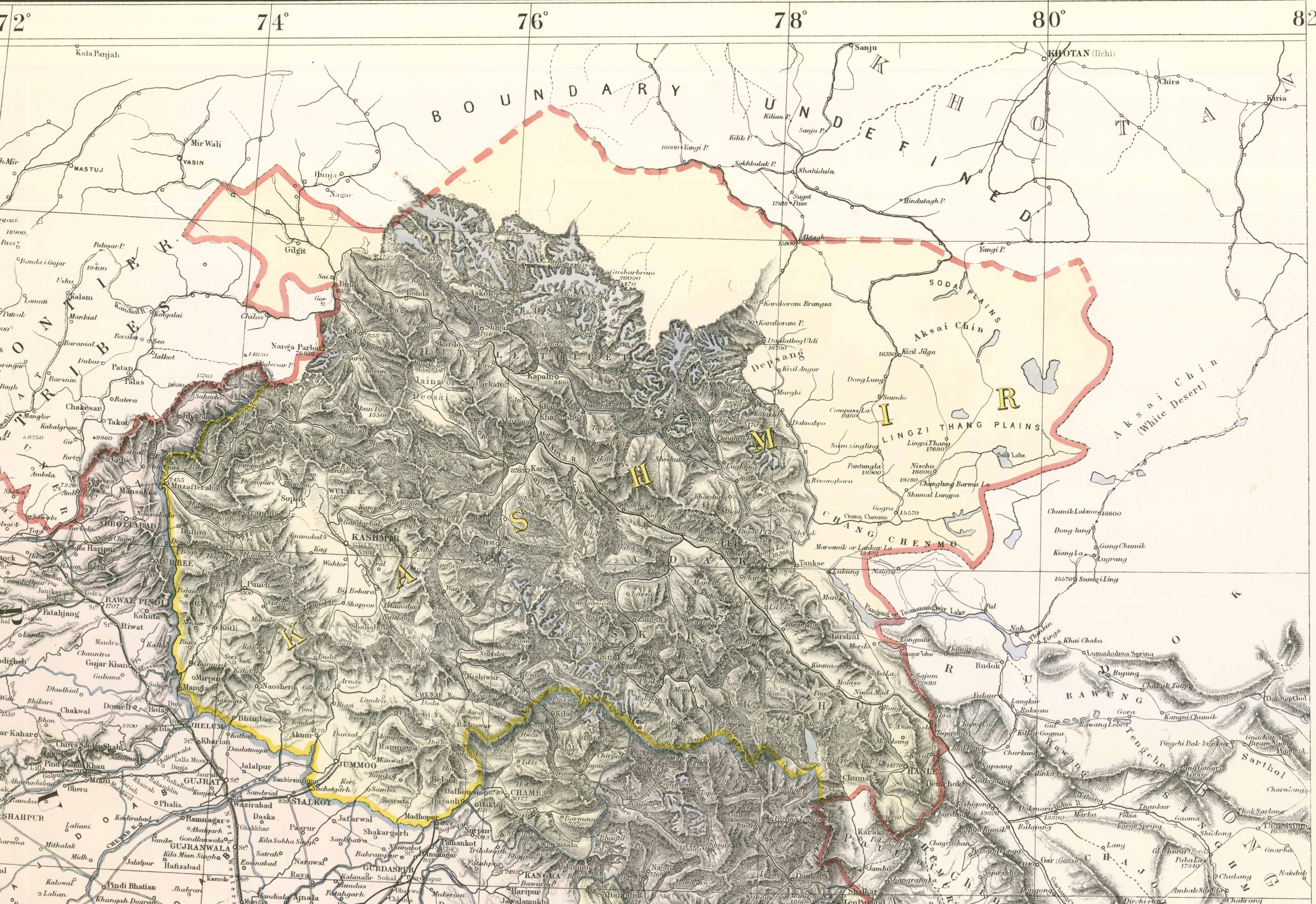 라다크는 1842년 시크 제국의 종주권 하에 굴라브 싱 (도그라) 라자의 군대에 의해 정복되었다.[21] 제1차 영국-시크 전쟁에서 시크교도의 영국 패배로 인해 라다크를 포함한 잠무 카슈미르 (번왕국) 지역이 영국으로 양도되었고, 영국은 굴라브 싱을 종주권 하의 마하라자로 임명했다. 영국은 알렉산더 커닝햄을 수장으로 하는 경계 위원회를 임명하여 주의 경계를 결정했다. 중국과 티베트 관료들이 국경을 공동으로 획정하도록 초청했지만, 그들은 아무런 관심을 보이지 않았다.[25][26] 영국 국경 위원들은 창 첸모 계곡까지 남쪽 경계를 고정했지만, 그 북쪽 지역은 ''미지의 땅''으로 간주했다.[26]