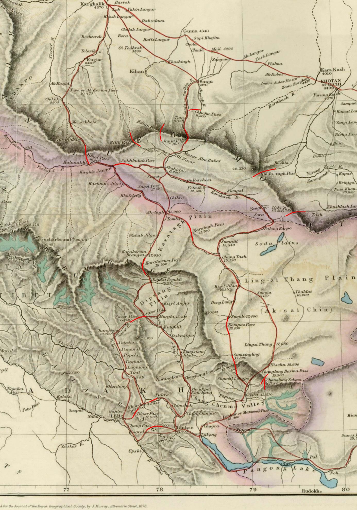 wikitext1947년 10월 잠무 카슈미르가 인도에 병합된 후, 인도 정부는 서부의 공식 경계선 기준으로 존슨 라인을 사용했으며, 이는 악사이친을 포함했다.[25] 인도 측의 경계선은 카라코람 산맥 북동쪽으로 악사이친의 소금 평원을 지나 쿤룬 산맥에서 경계를 설정하며, 카라카쉬 강과 야르칸드 강 유역의 일부를 포함한다.[19]